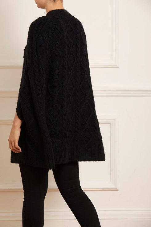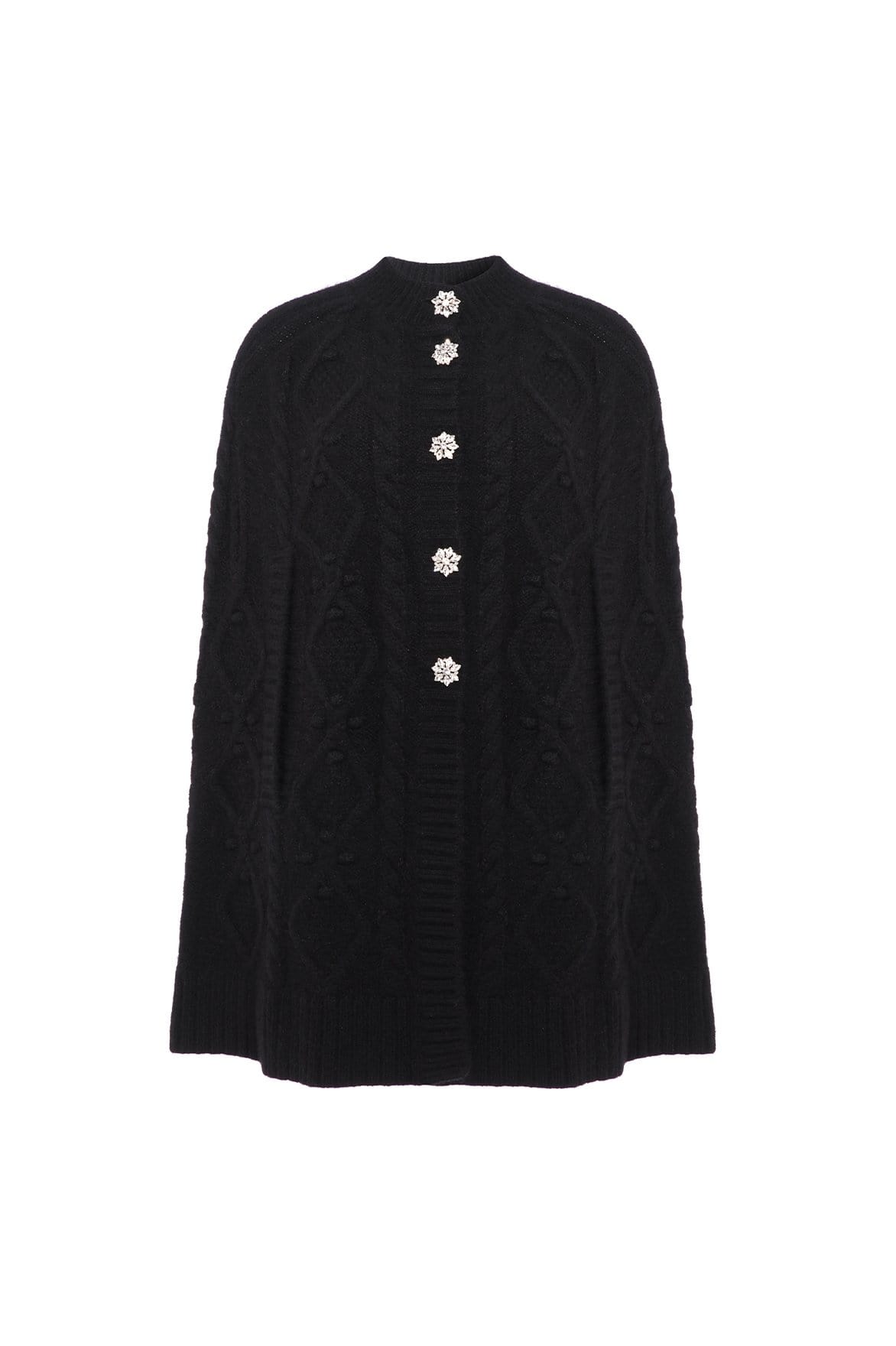 NEEDLE & THREAD EXCLUSIVE. The Sylvie Cable Jewelled Knee Length Cape in Jet Black. This cape is developed from alpaca yarn, creating a cosy feel with a fluff texture finish. Adorned with jewelled diamante buttons down the front of the cape, creating a subtle shimmer. This easy styling piece is decorated with mixed cables in diamond and twist textiles throughout. Designed with long sleeves, split openings and volume to create a romantic style statement. A key statement piece of the season.