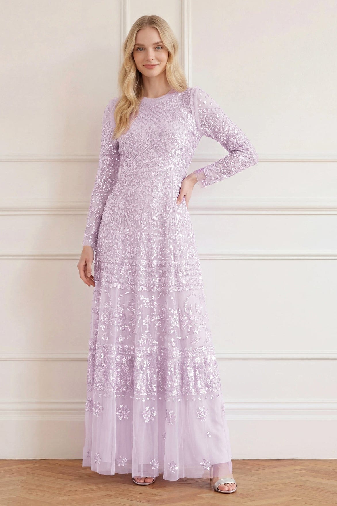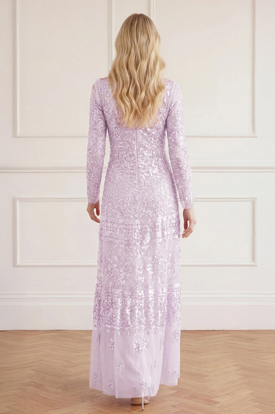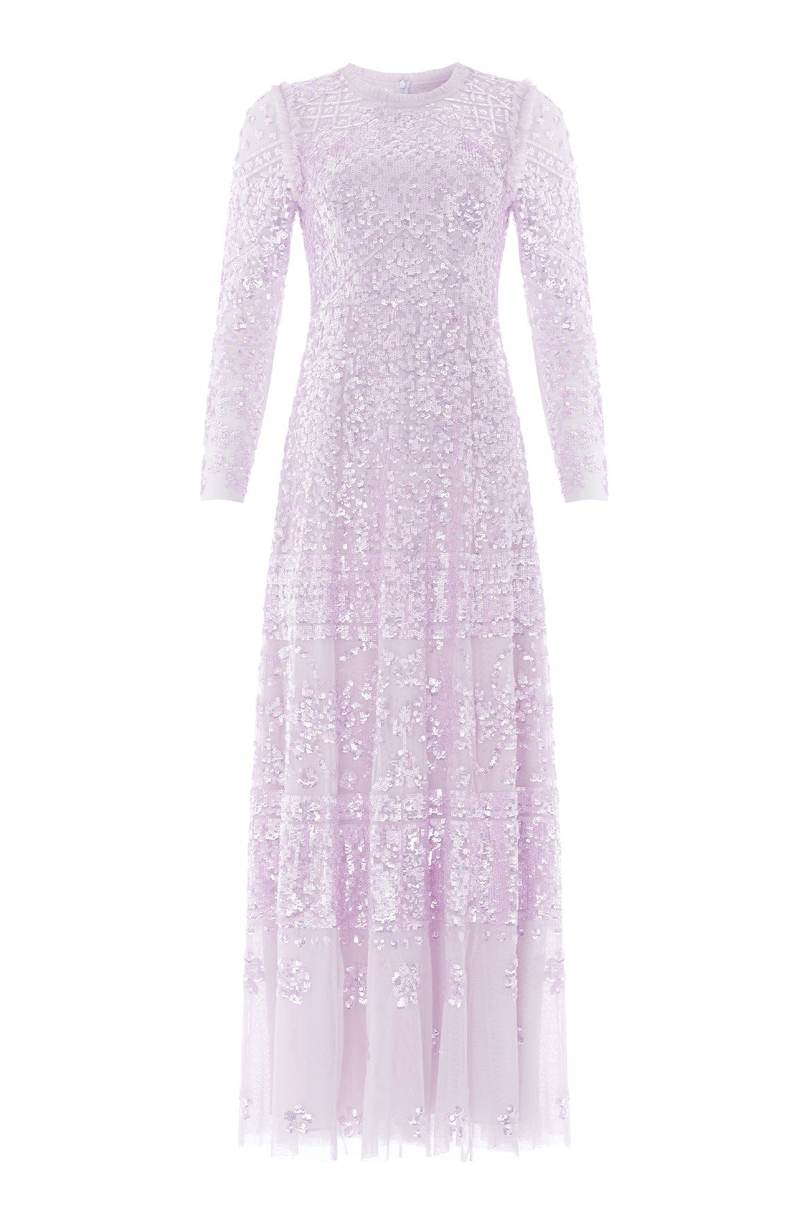 NEW SEASON. The Aurora Gown in Powder Lilac. Inspired by dreamlike garden landscapes, this Needle & Thread signature style features a graceful, flowing silhouette with delicate feminine detailing. Designed for effortless movement, it offers timeless elegance for evening and special occasions.