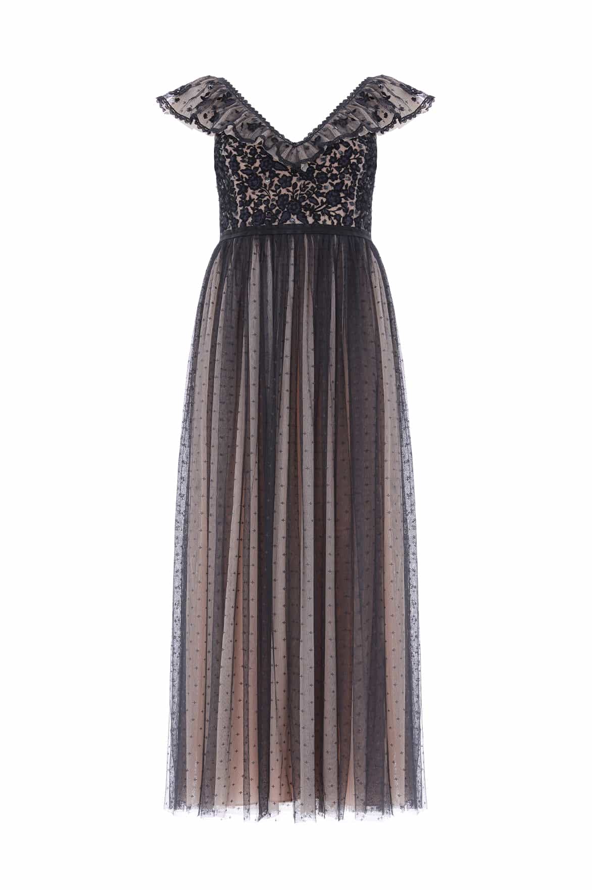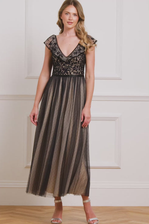 The Adeline Bodice Ankle Gown in Graphite/Beige. A true statement piece for the season. Crafted with heritage-inspired embroidery and signature kisses 'x' tulle, this gown is adorned with shimmering sequin accents that trail gracefully across the bodice and border the skirt in meticulously placed scallops and ribbon motifs. Designed to flatter, the fitted bodice and nipped-in waist create an elegant silhouette, falling into a soft, romantic skirt that glides at ankle length. A striking choice for black-tie events or formal winter soirées, embodying modern femininity with timeless charm.