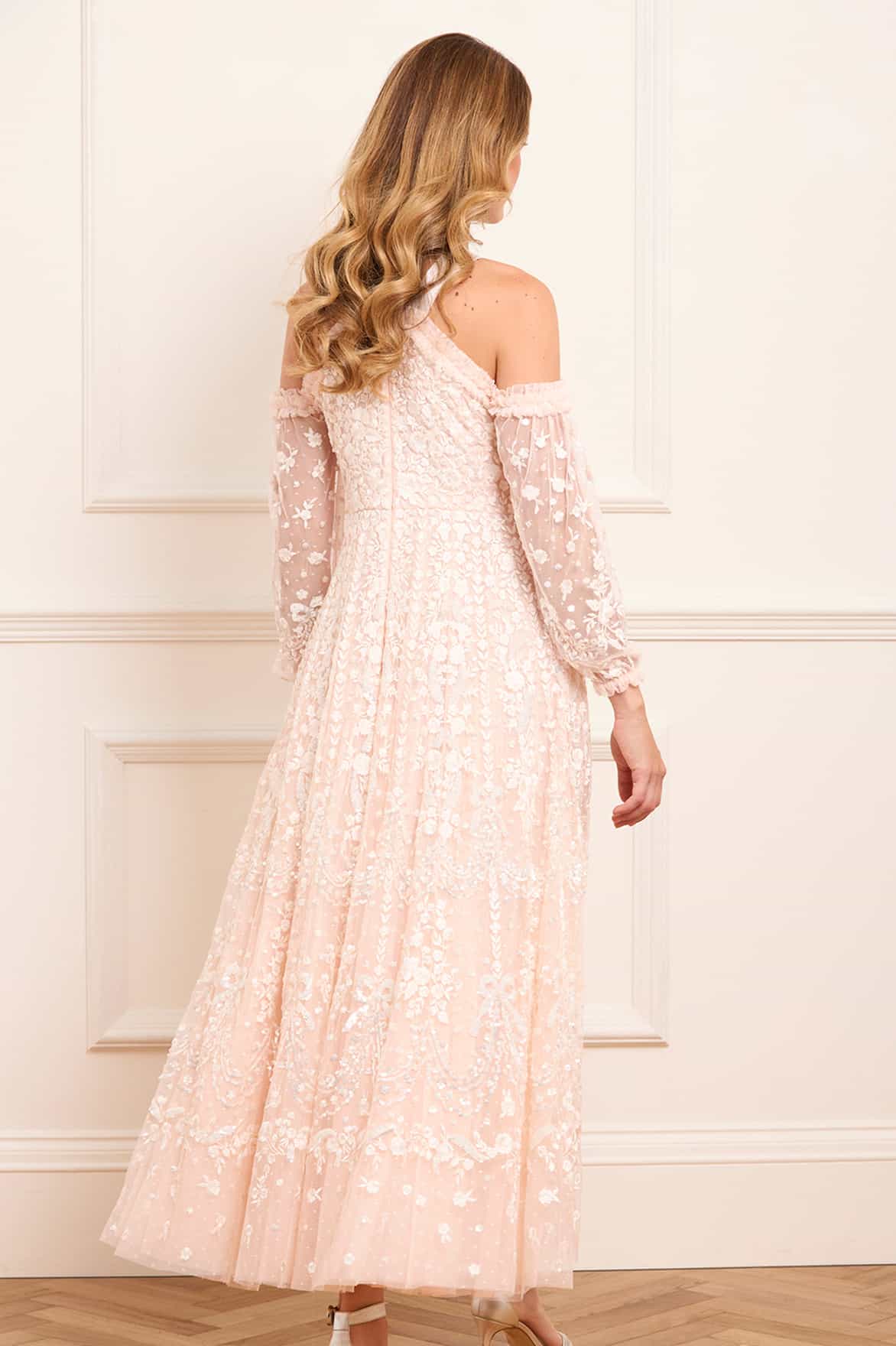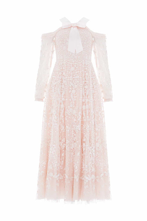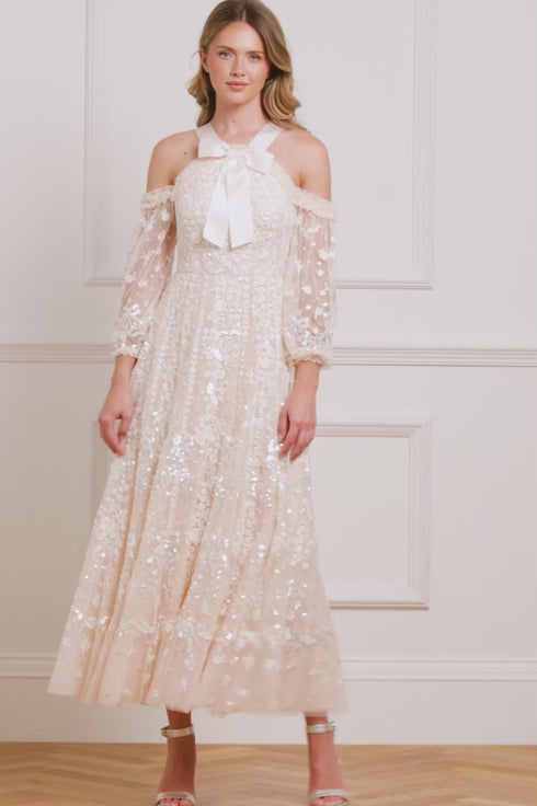 The Adeline Off-Shoulder Ankle Gown in Opal/Cream. A dramatic take on evening elegance. Delicately embroidered with Victorian-era inspired florals, bows and scallops in contrast graphite thread, this off-shoulder silhouette embraces romance with a contemporary twist. Shimmering sequin embellishments enhance the flattering fitted bodice, while the ankle-length skirt flows into a cascade of softly glinting florals.