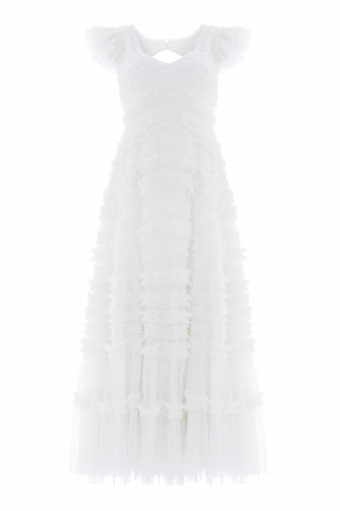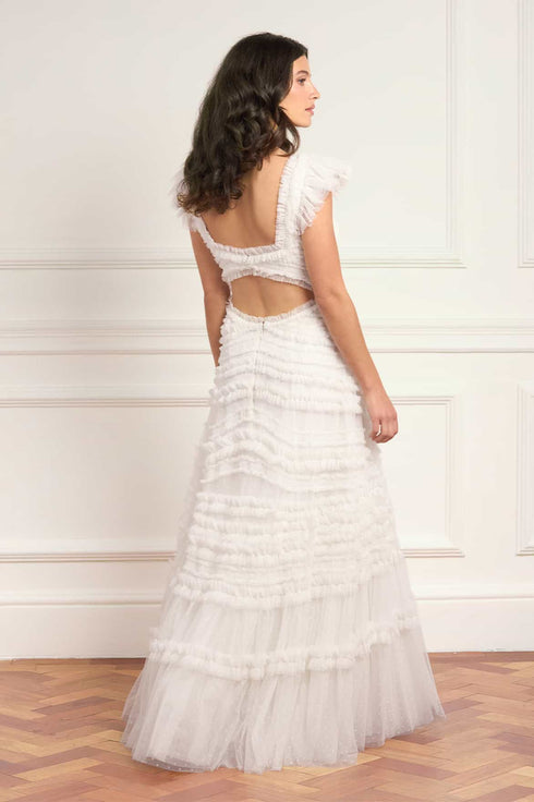 NEW SEASON | NEEDLE & THREAD EXCLUSIVE. The Amara Backless Gown in Swan White. Inspired by Victorian garden artistry, featuring curved ruffle bands that sculpt the body before cascading into a flowing full-length skirt. A statement open back and frothy frilled shoulders add a signature Needle & Thread finish.