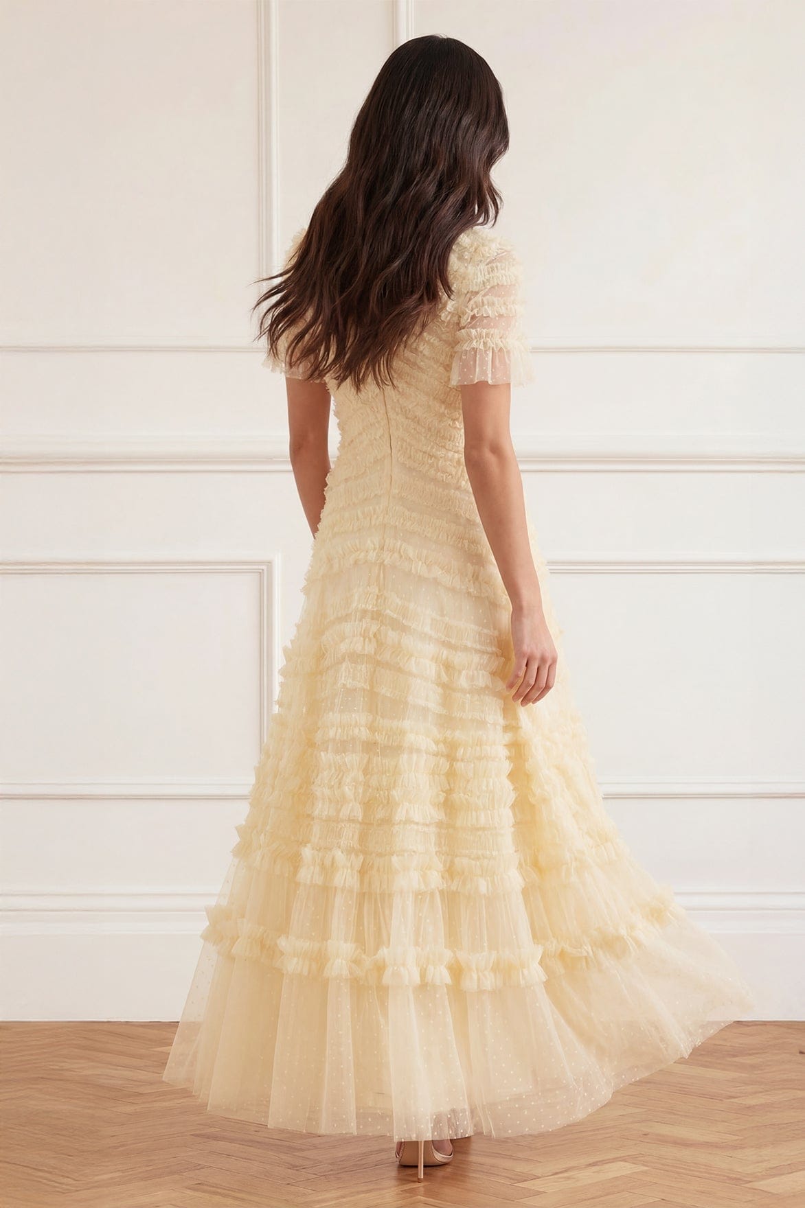 NEW SEASON. The Amara Backless Gown in Lemon Sorbet. This luminous gown features curved ruffle bands flowing across the body, inspired by the beauty of painted garden landscapes. Finished with a statement backless design and a voluminous skirt, it offers graceful movement for special occasions.