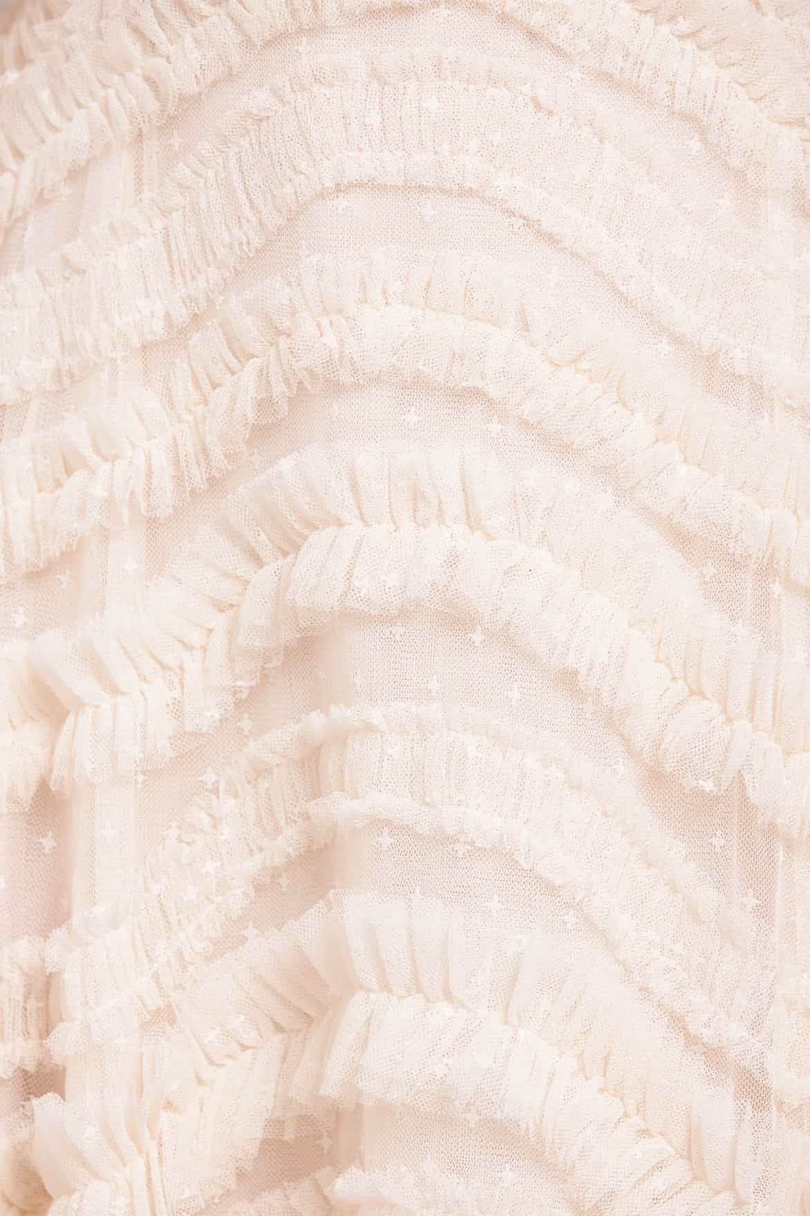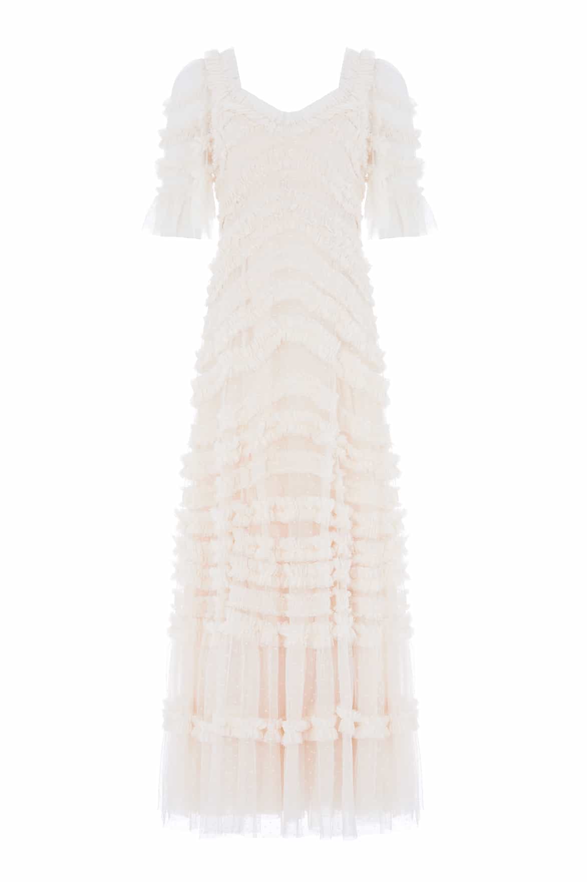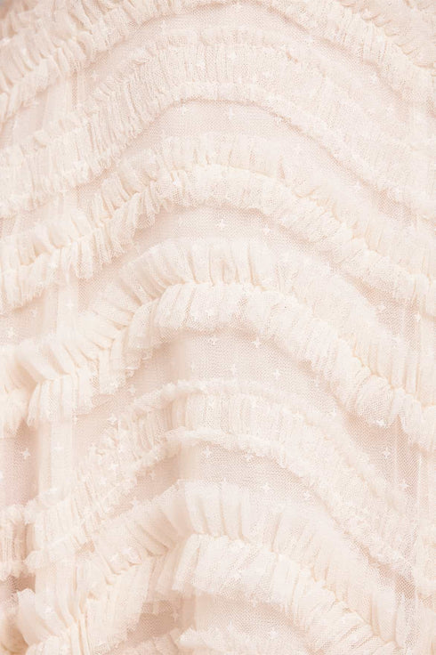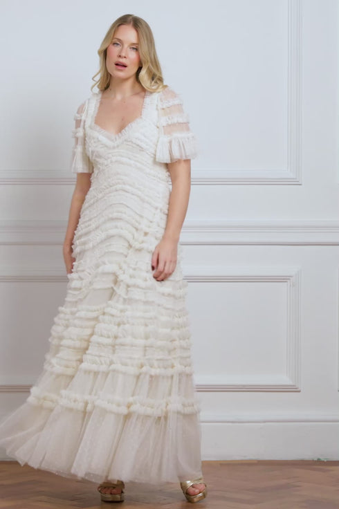 NEW SEASON. The Amara Ruffle Gown in Cream. Crafted from layers of soft tulle, beautifully engineered with cascading ruffles that create graceful movement. Featuring frothy fluted sleeves and a sweeping hemline, this romantic gown captures the spirit of ethereal femininity.