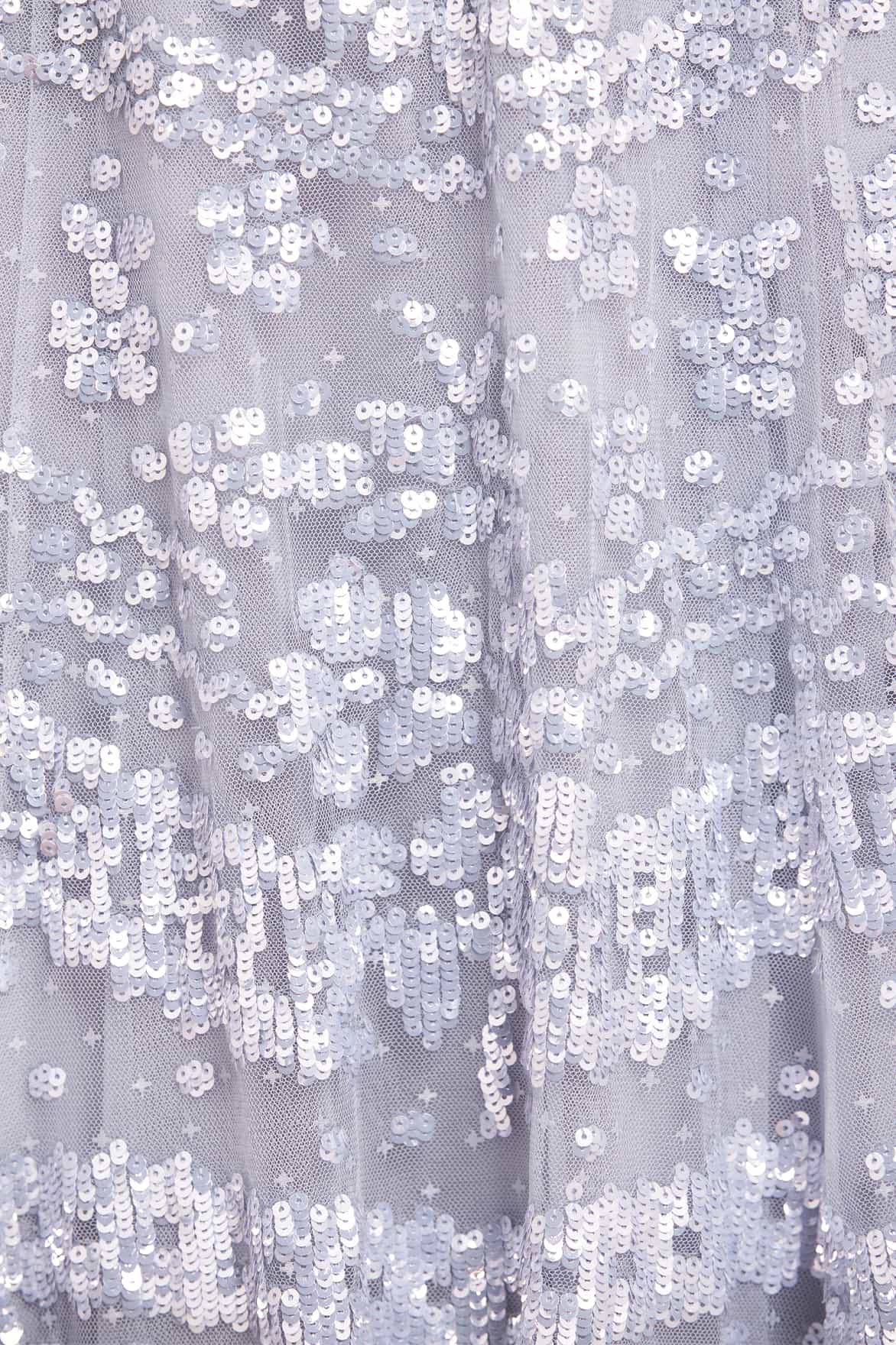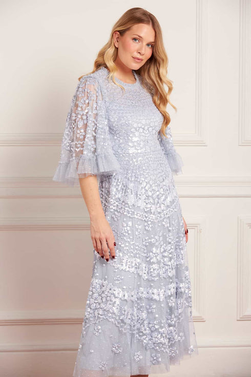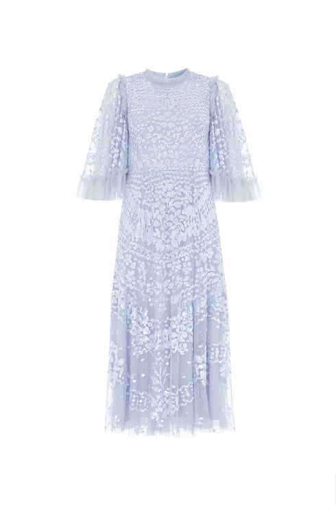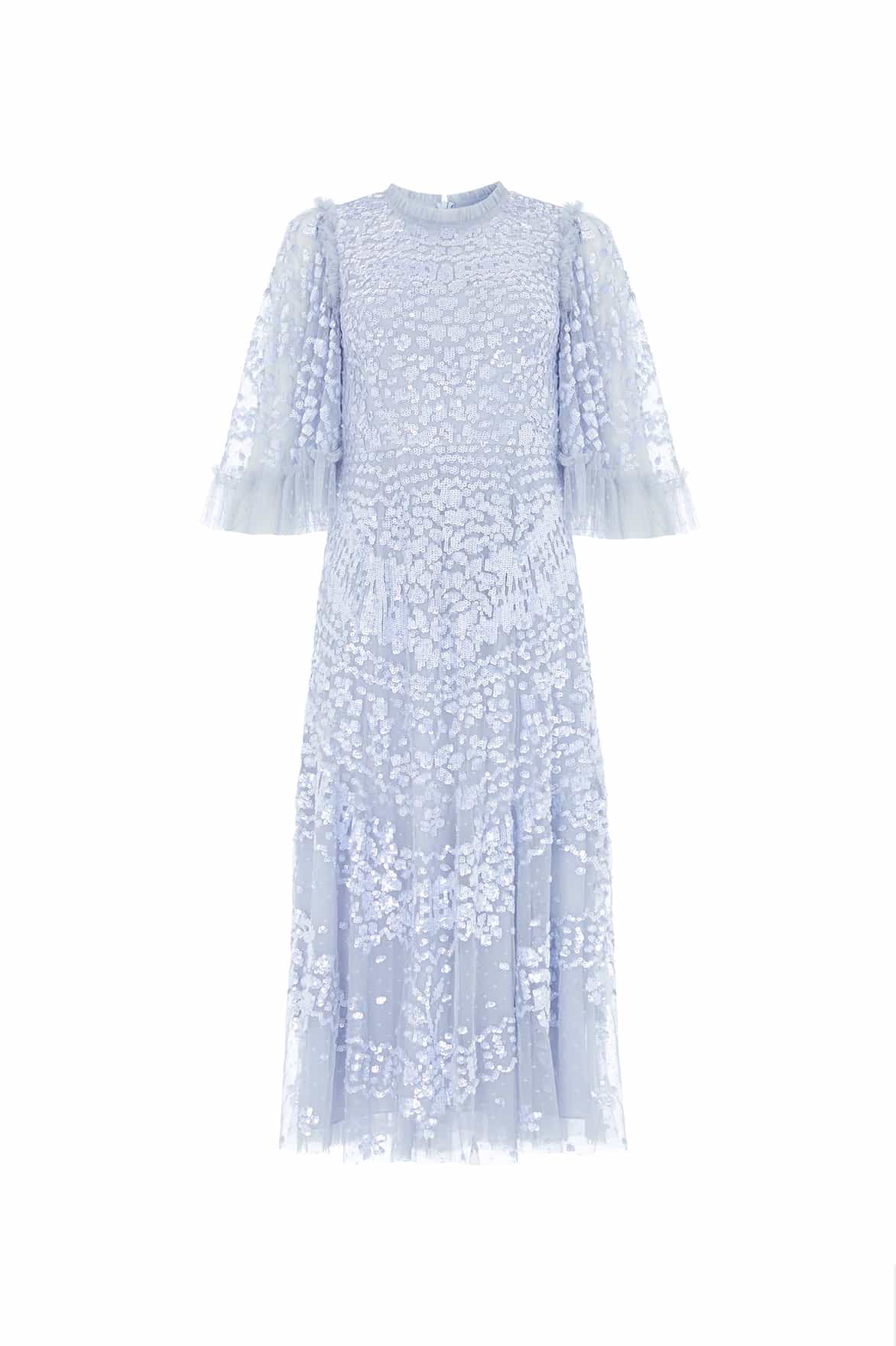 NEW SEASON | NEEDLE & THREAD EXCLUSIVE. The Anais Sequin Ballerina Dress in Skylight. A romantic statement piece adorned with shimmering sequin artwork inspired by vintage French lace. Crafted from soft tulle, this style features delicate fluted sleeves and gentle frill detailing, creating graceful movement with every step.