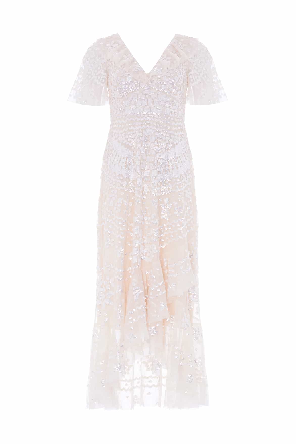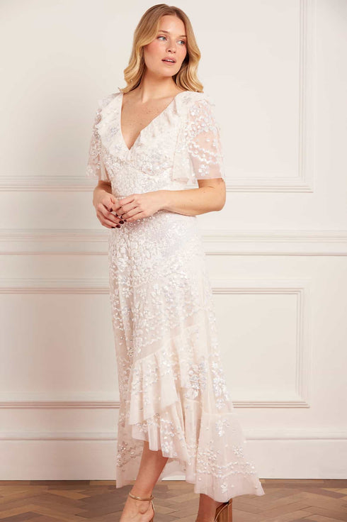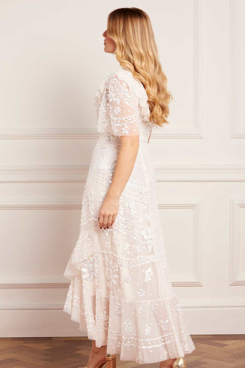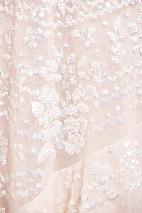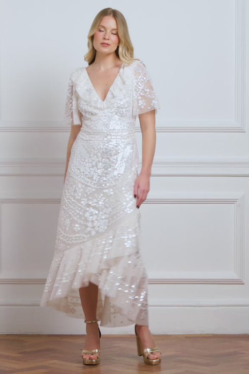 NEW SEASON. The Anais Sequin Frill Ankle Gown in Cream. Inspired by charcoal drawings of vintage French lace. Embellished with shimmering sequins and romantic circle-cut frills, this cream tulle gown captures timeless glamour with delicate fluted sleeves and elegant fluidity