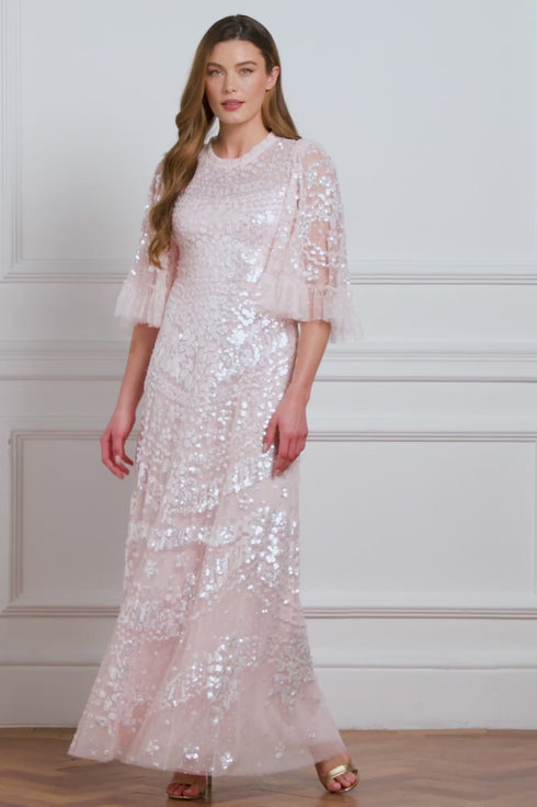 NEW SEASON. The Anais Sequin Gown in Seashell. Adorned with intricate sequin artwork inspired by early 1900s French lace. Designed with a soft fitted bodice and a flowing tulle skirt, this seashell-toned gown shimmers delicately, perfect for romantic evening occasions.