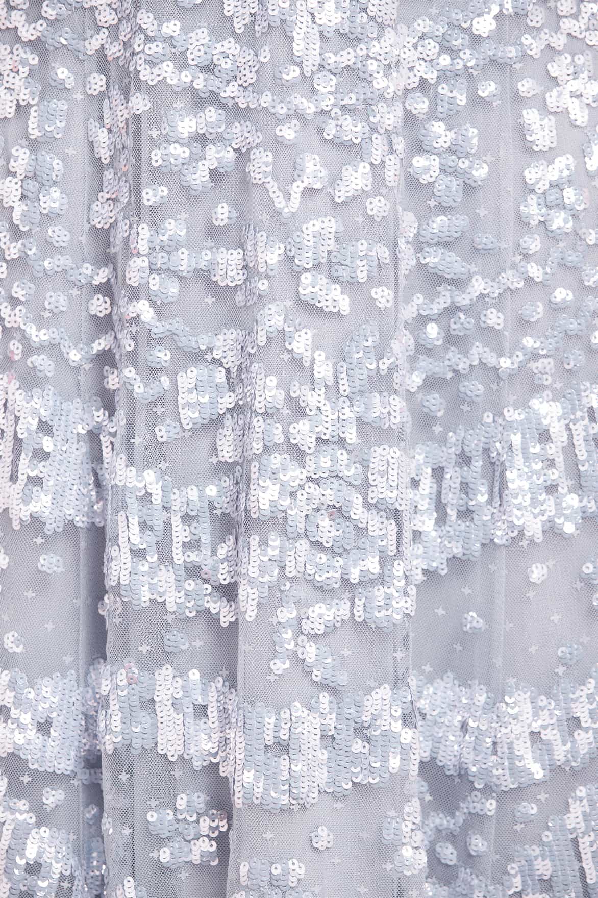 NEW SEASON. The Anais Sequin Gown in Skylight. A luminous statement piece inspired by vintage French lace. Crafted from soft tulle and adorned with shimmering sequins in a delicate border design, this gown features romantic circle-cut frills and fluttering sleeves for graceful movement and timeless allure.