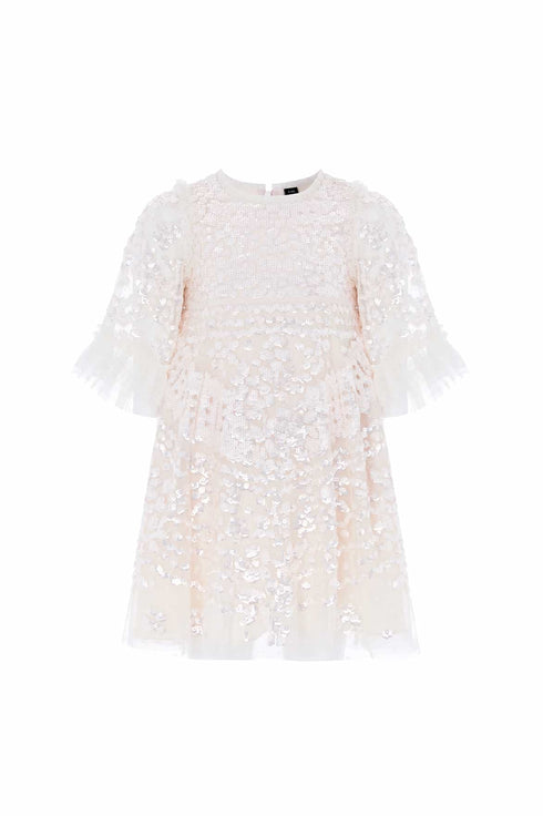 NEW SEASON. The Anais Sequin Kids Dress in Cream/Seashell. Adorned with glistening sequins inspired by vintage lacework. With flutter sleeves and a full tulle skirt, this piece brings soft sparkle and elegance to any special occasion.