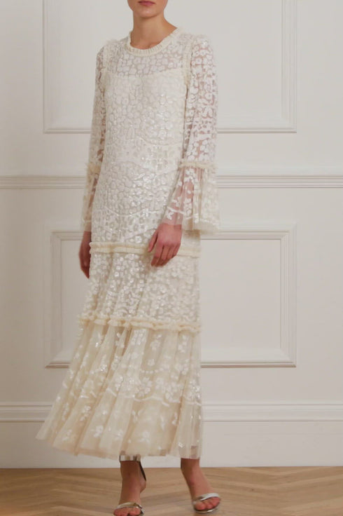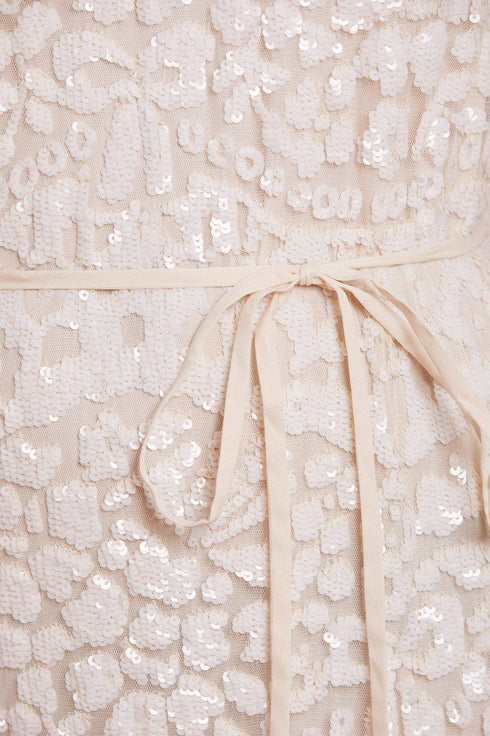 The Annie Sequin Tiered Ankle Gown in Champagne. Adorned with shimmering sequins in a floral and bow artwork, this gown is inspired by a lace tablecloth. Designed with a loose fit silhouette and tiered throughout, creating beautiful movement. Make an effortless statement.