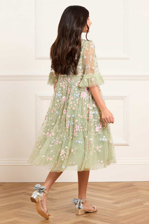 The Antoinettes Floral KIDS Dress in Meadow. Inspired by the opulent interiors of the Palace of Versailles, this enchanting dress features intricate multicoloured floral embroidery, with luxurious bouquets cascading delicately toward the hem. Designed with short fluted sleeves with frill cuffs and signature Needle & Thread tulle frills at the neckline and shoulders add romantic detail. The voluminous skirt, crafted from generous layers of net and tulle, is made for twirling—perfect for any special moment.
