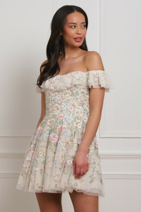 The Antoinettes Floral Off-Shoulder Micro Mini Dress in Cream. Inspired by the grandeur of Versailles, this mini dress features delicate, multicoloured floral embroidery trailing elegantly to the hem. The off-shoulder neckline is framed with playful circle-cut frills, while layers of soft net and tulle create a full, floaty skirt with a sweeping finish. A magical blend of romance, drama, and fairytale charm.