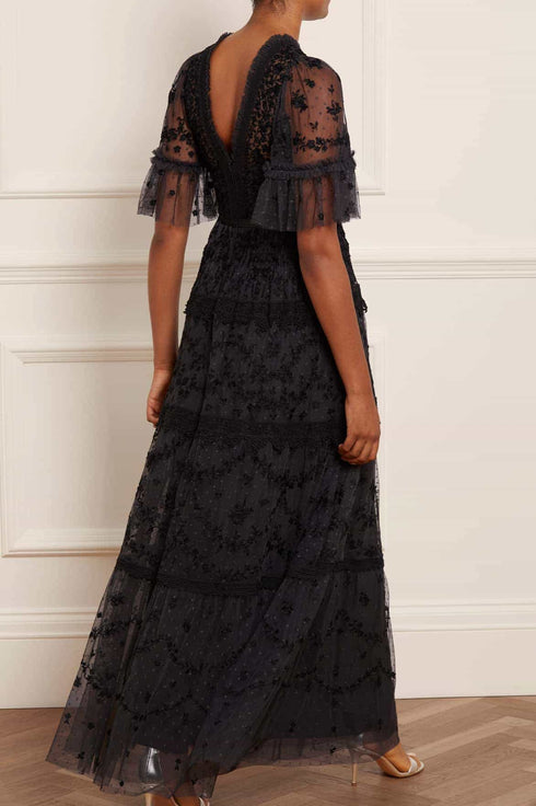 The Araminta Lace Gown in Graphite / Black. This signature Needle & Thread style is designed with an intricately embroidered artwork. Beautifully adorned with lace trims, a layered tulle skirt and a romantic silhouette. The perfect gown for a special upcoming occasion.