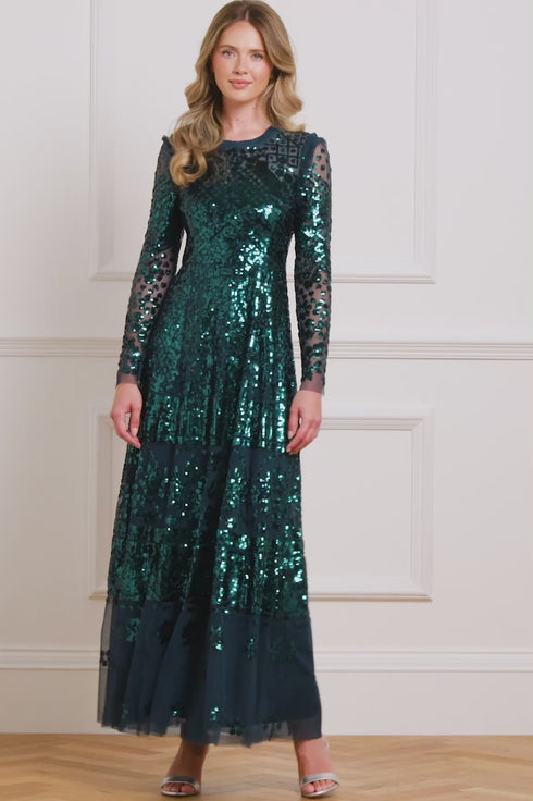 NEW SEASON | NEEDLE & THREAD EXCLUSIVE. The Aurora Gown in Emerald. A timeless signature style from the Needle & Thread archive. This heritage design features intricately embroidered floral motifs that shimmer with tonal sequins across the bodice and layered tulle skirt. In a rich jewel tone, this archival favourite is reimagined for AW25 as a statement piece perfect for glamorous evenings.