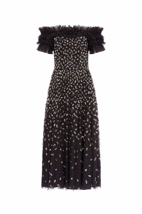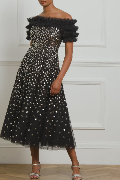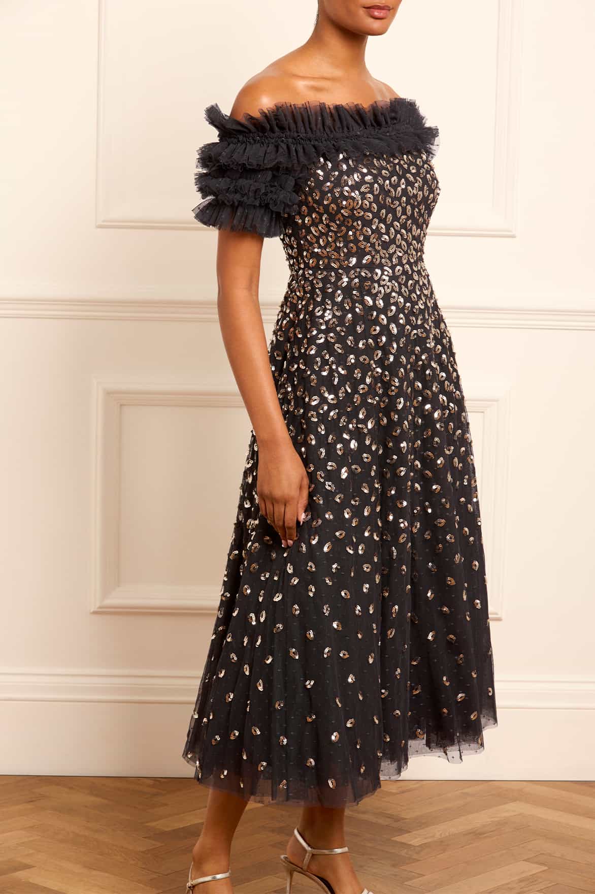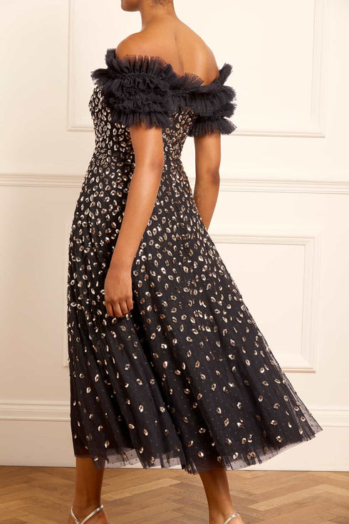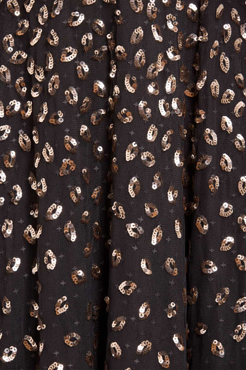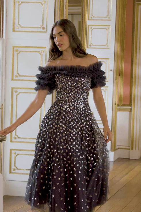 The Autumn Leaves Off-Shoulder Ballerina Dress in Graphite/Caramel. This ethereal piece is adorned with a glittering leaf motif that cascades gently towards the hem, capturing the essence of autumnal elegance. The dress features a romantic off-the-shoulder design complemented by tiered sleeves, each delicately edged with shimmering sequin embellishments. Crafted for comfort and style, the dress includes an internal corset made from stretch power mesh, ensuring a flawless fit while maintaining the garment's structure. The skirt is a true masterpiece, made up of layers of soft, delicate tulle and net, creating a generous and flowing silhouette that’s perfect for any special occasion.