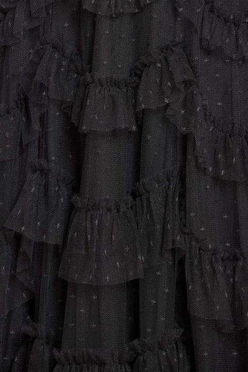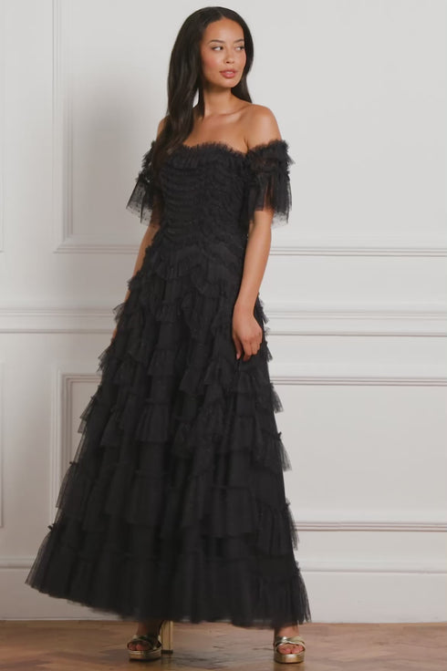 NEW SEASON. The Aviana Off-Shoulder Gown in Graphite. Modern and moody, this gown is an elevated eveningwear piece designed to mesmerise. Graduated tulle scallops cascade across the silhouette, balancing volume with lightness and the graphite tone offers a cool, contemporary twist on femininity.