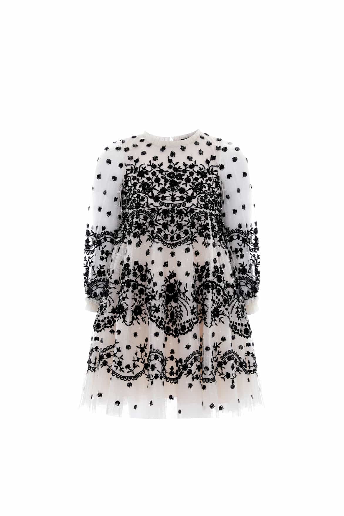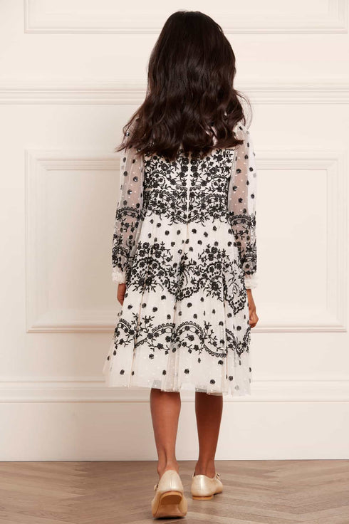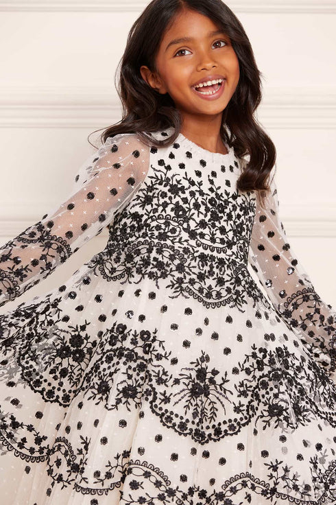 NEW SEASON. The Beatrice KIDS Dress in Cream / Black. Inspired by 1900's vintage pieces, this statement KIDS dress is beautifully decorated with delicate lace and embellished polka dots. Crafted with layers of tulle and net creating a playful voluminous ssilhouette. A new favourite for the season ahead.