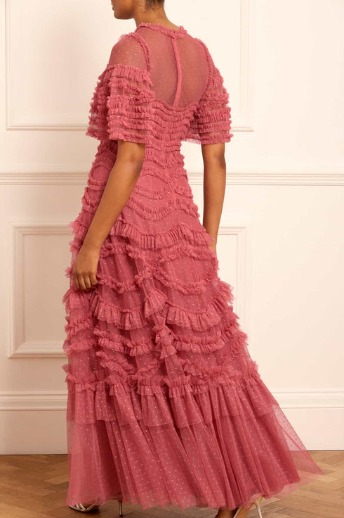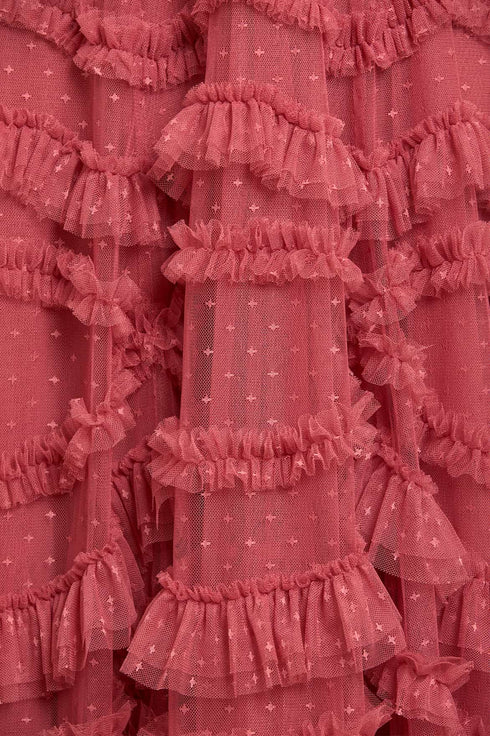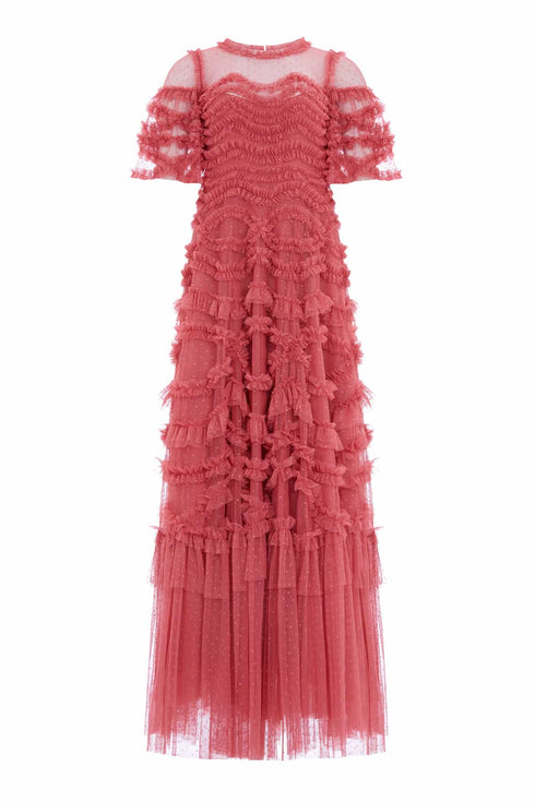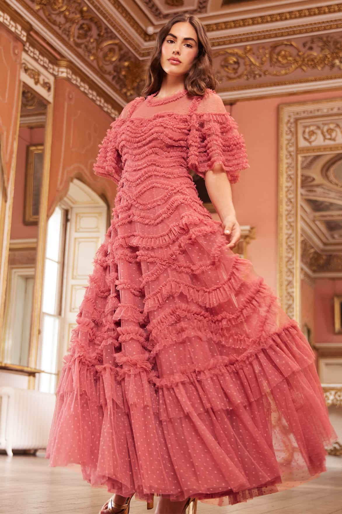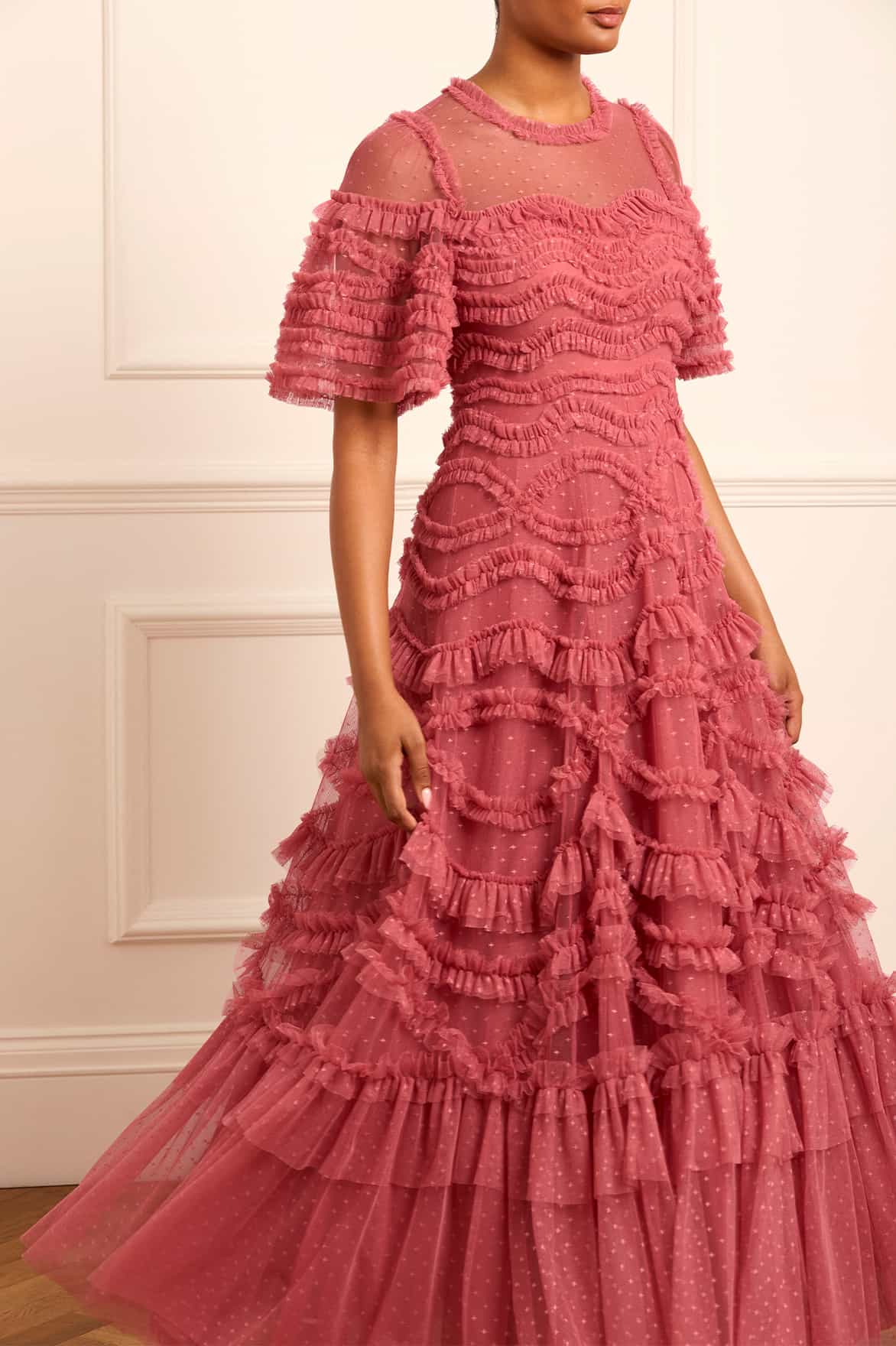 The Bronte Gown in Autumn Rose. This gown features an exquisite textile meticulously developed in 3D by the designer, directly onto the mannequin. Beautifully developed with romantic, frothy frills arranged in intricate scallops and oval designs that gracefully adorn the bodice and skirt. Designed with short fluted sleeves and delicate tulle ruffles that mirror the gown's intricate detailing. The silhouette is exceptionally flattering, with a fitted bodice that flows into a generous skirt made up of layers of net and tulle, culminating in a sweeping hemline that ensures a breathtaking entrance.