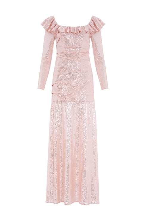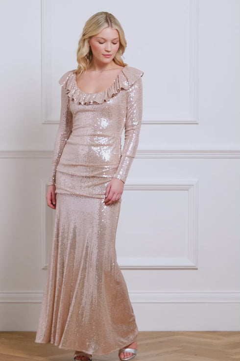 The Camille Long Sleeve Gown in Pearl Pink. This gown exudes vintage Hollywood glamour. Featuring a scoop neck with sequin frill and a slim silhouette, it gracefully drapes across the body. Crafted from a stretch mesh base, its delicate sequins create a shimmering effect, adding timeless elegance to this romantic gown – a true treasure for years to come.