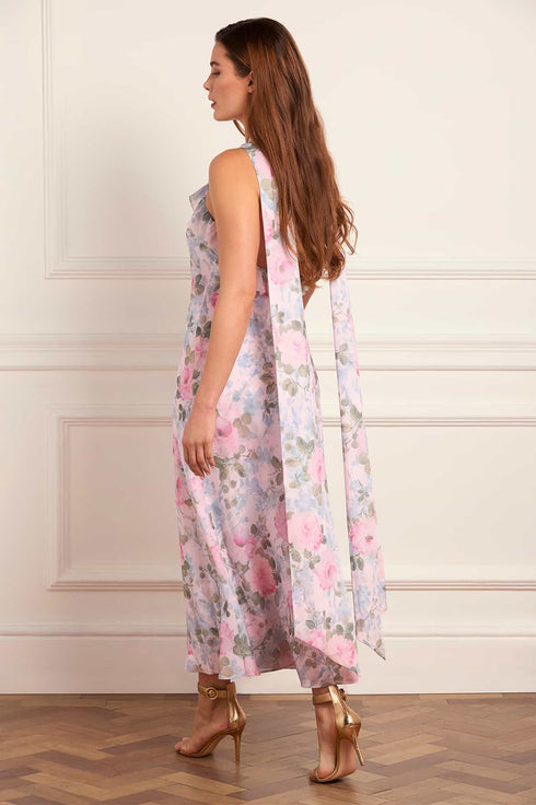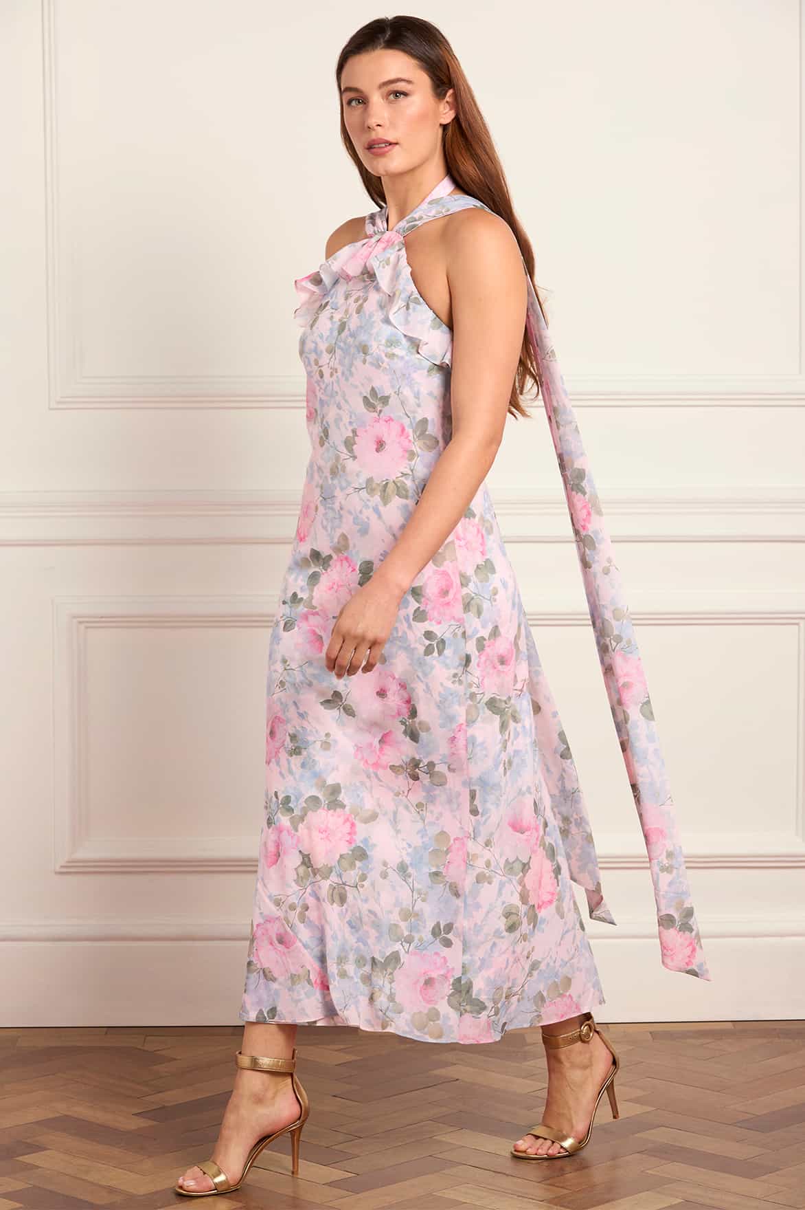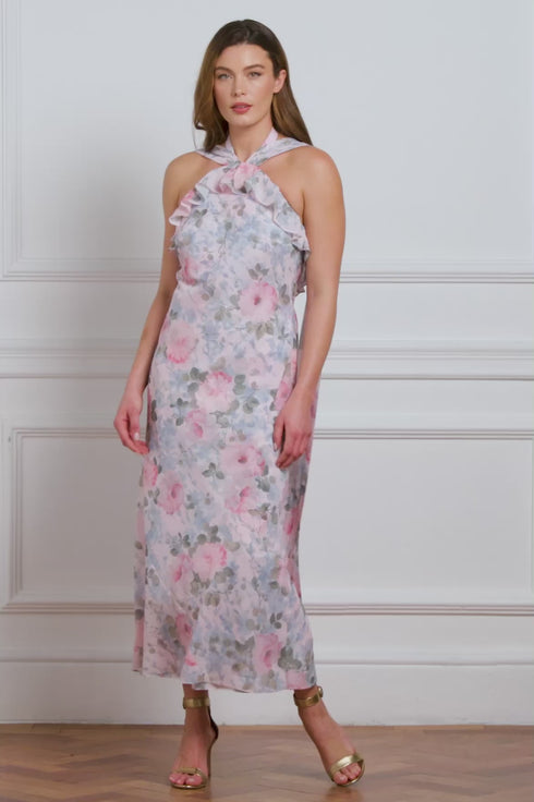 NEW SEASON. The Camille’s Garden Chiffon Halter-Neck Ankle Gown in Seashell. Features a vintage-inspired floral print in soft watercolour tones. Designed with a flattering halter neckline and flowing chiffon skirt, this gown moves beautifully and captures a timeless, romantic spirit.