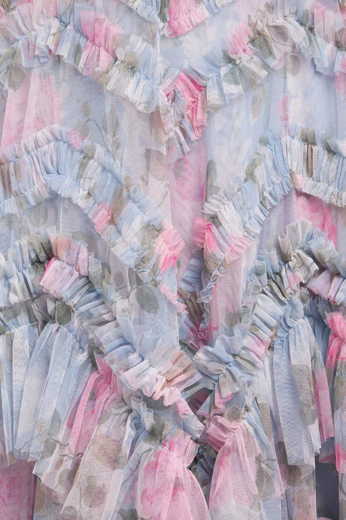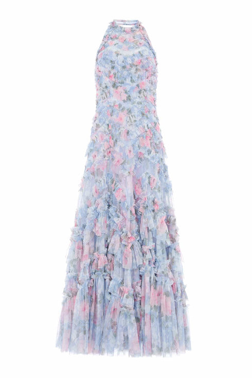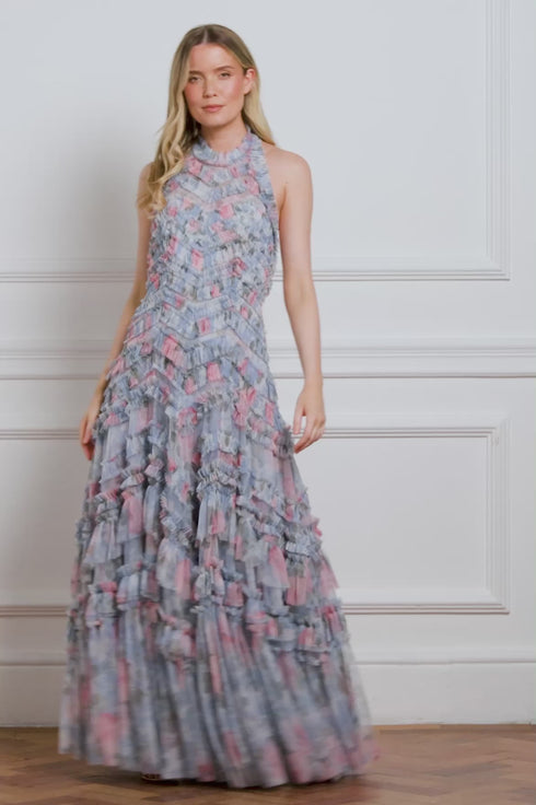NEW SEASON. The Camille’s Garden Elia Halter-Neck Gown in Skylight. Features a soft, painterly floral print inspired by vintage artwork. Designed with a halter neckline and long sash tie at the back, this chiffon gown moves beautifully for a refined, romantic finish.