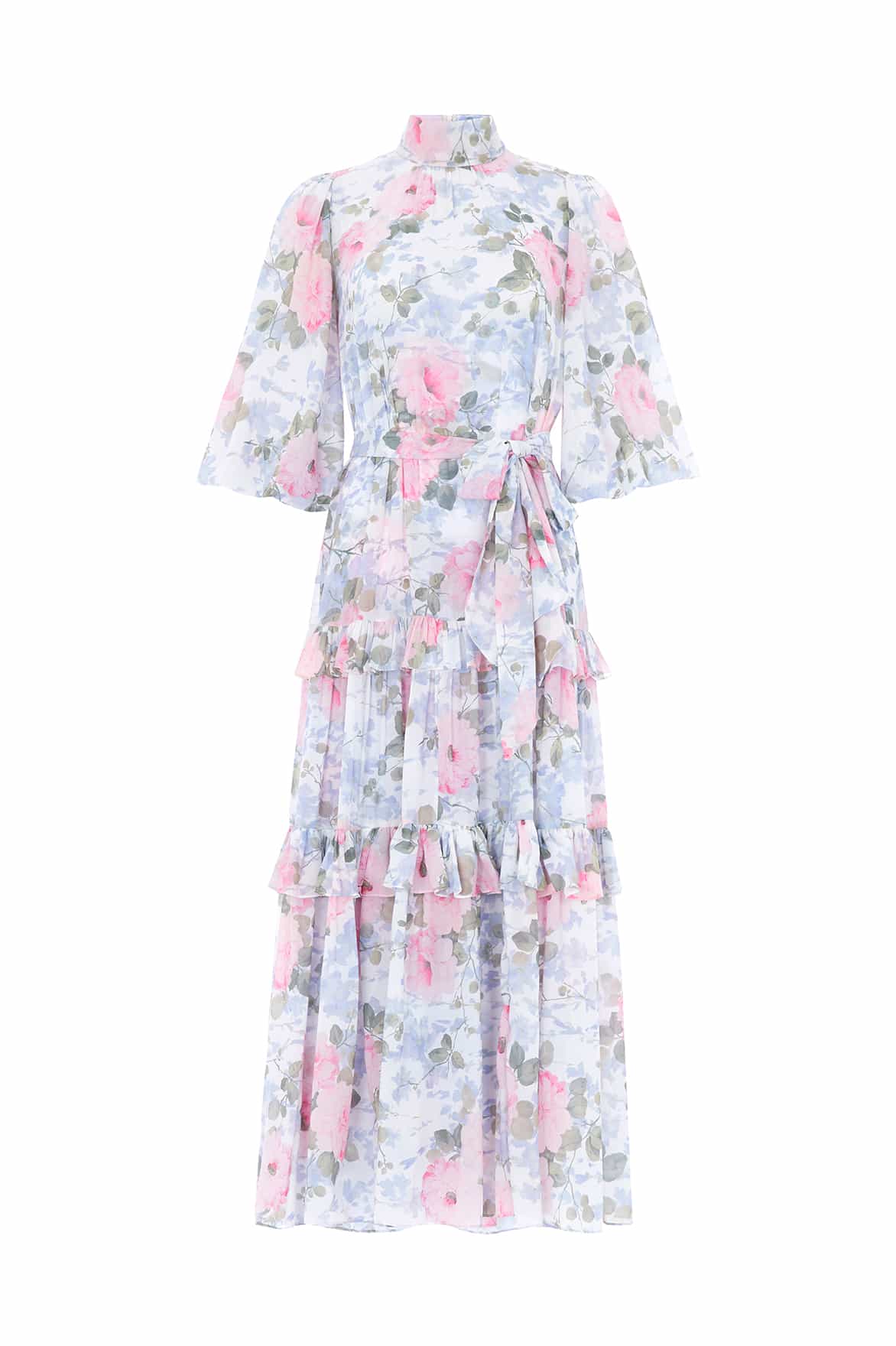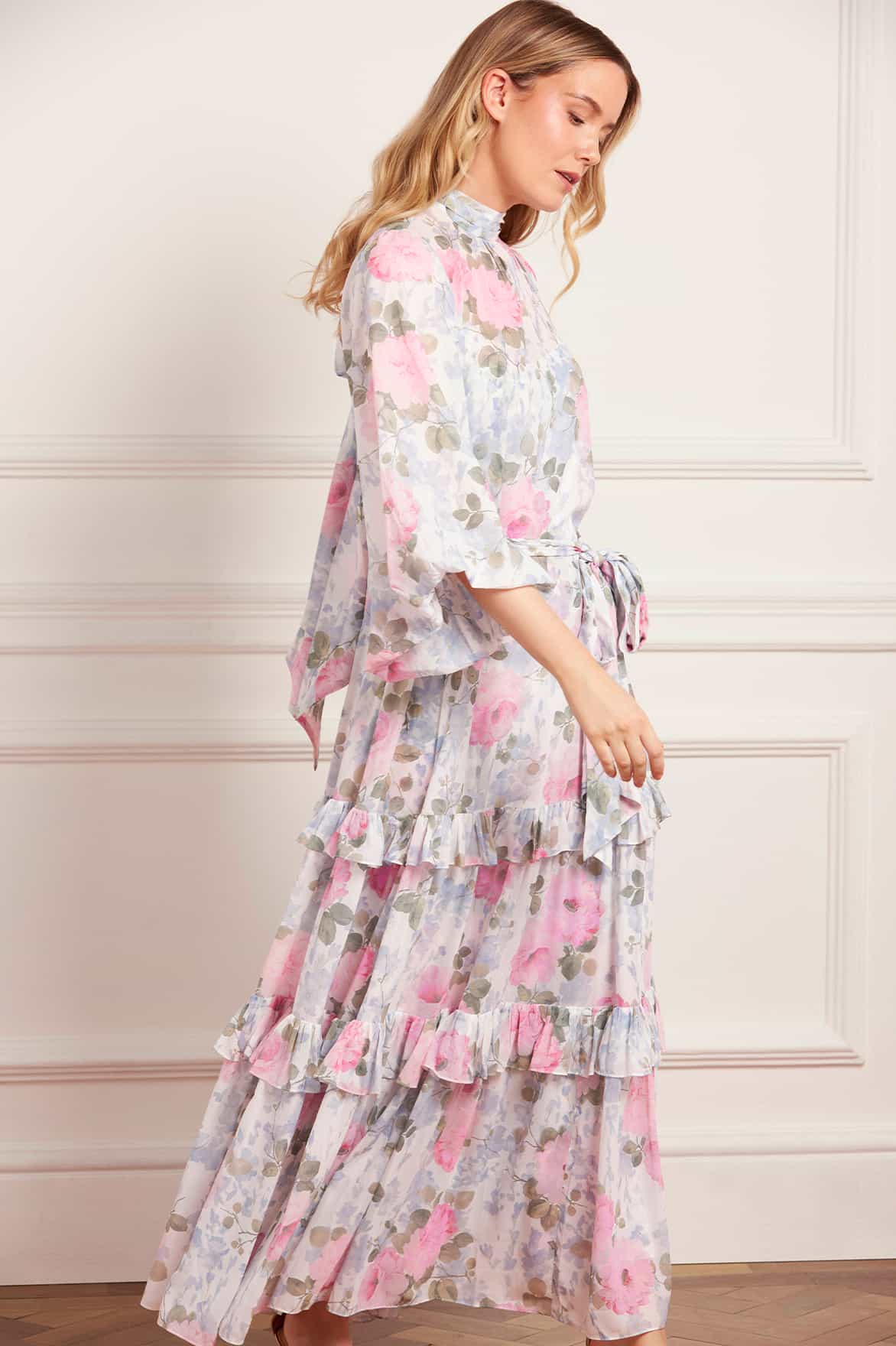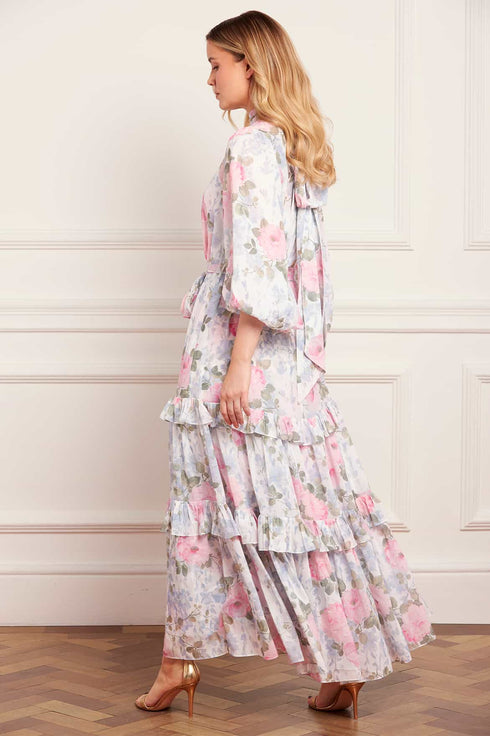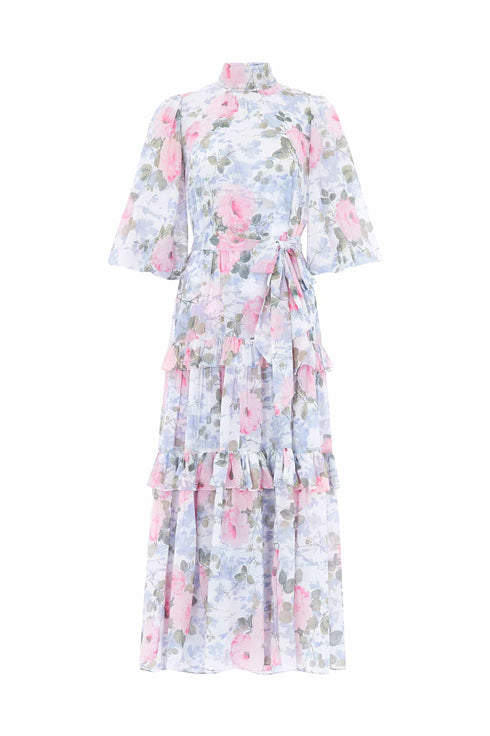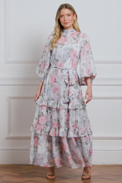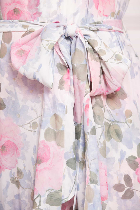 NEW SEASON. The Camille’s Garden Louisa Chiffon Ankle Gown in Moonshine. Adorned with a painterly floral print inspired by hand-painted artwork from the early 1900s. Cut from lightweight chiffon with a softly gathered skirt, this gown exudes timeless elegance and fluid movement.