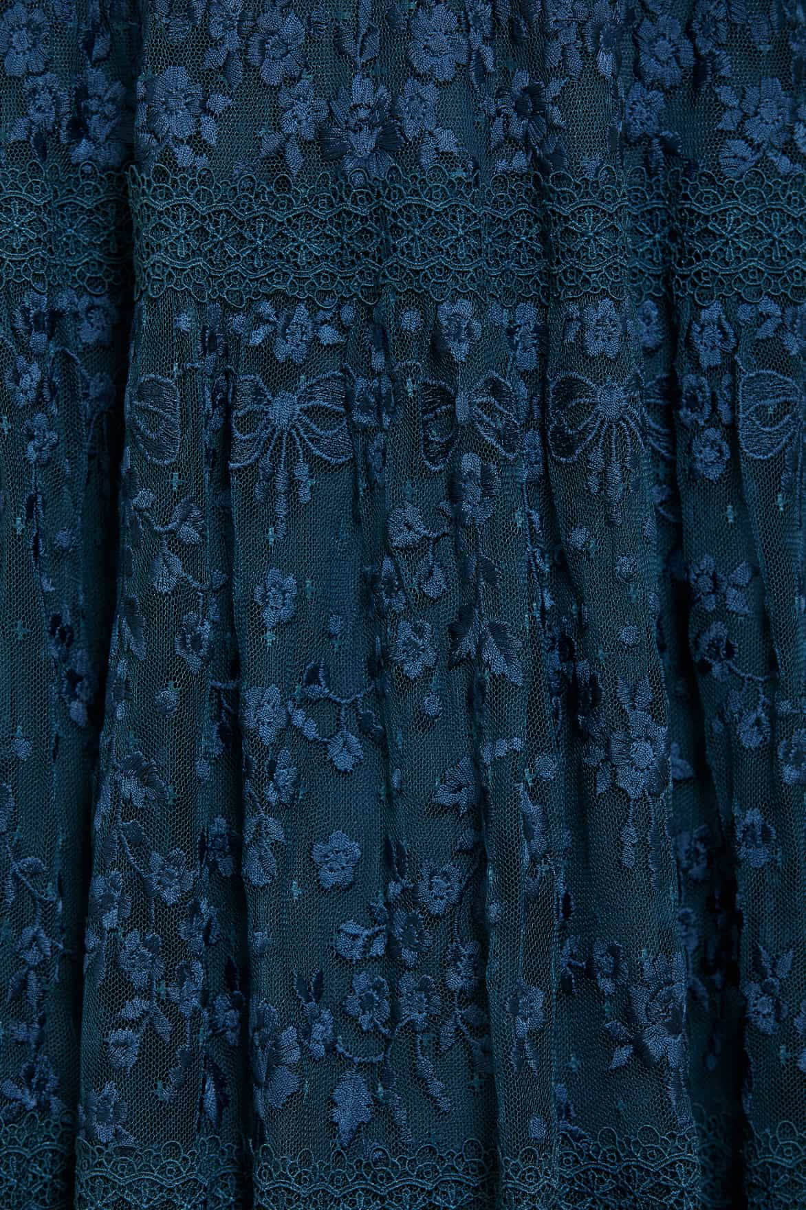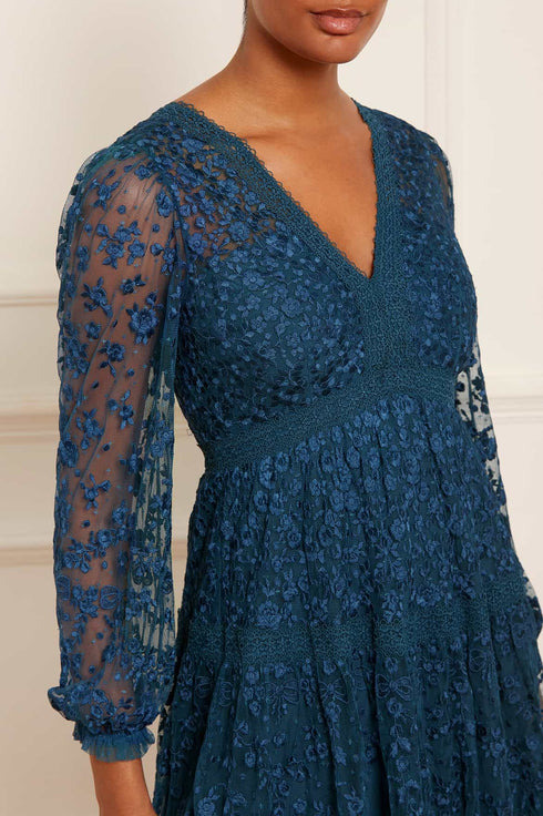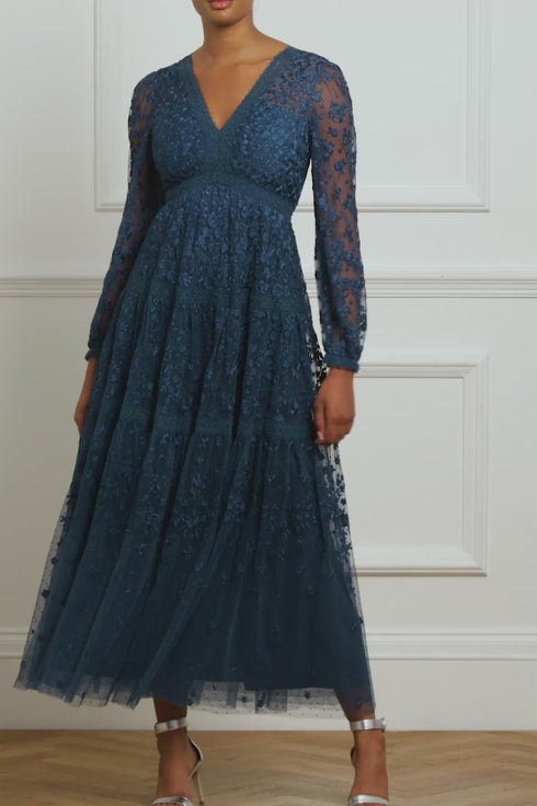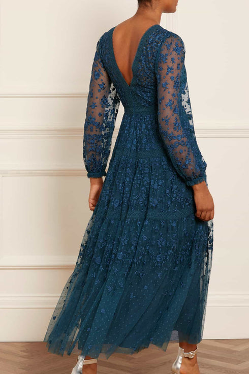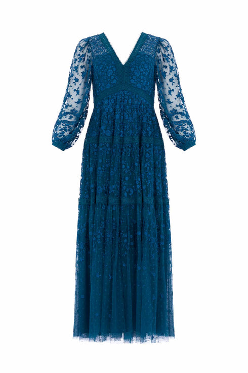 The Celestia Ribbon Ankle Gown in Teal. This gown has been intricately designed with rich embroidery inspired by vintage lace, featuring delicate floral motifs and ribbon bows throughout. Crafted with pretty lace trims for signature Needle & Thread detailing, and delicately constructed with a textured tulle fabric base. Featuring a V-shaped neckline and a new, ultra-flattering silhouette. Make the ultimate statement in the Celestia.