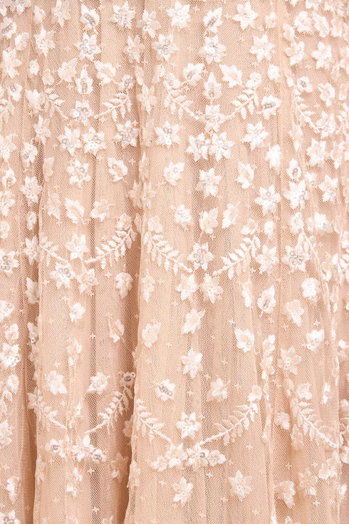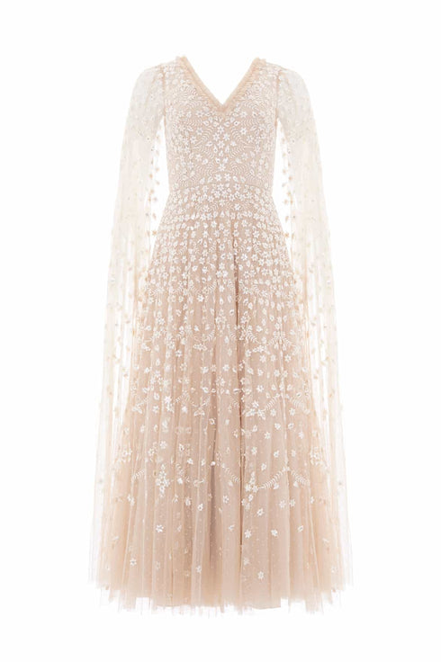 The Clover Cape Sleeve Ankle Gown in Beige/Cream. A romantic, vintage-inspired silhouette. Delicate embroidery decorates the signature kisses 'x' tulle base with ditsy florals and scalloped foliage designs. The softly draped cape sleeves add a whimsical touch, while the embroidery widens and disperses towards the hem for an ethereal finish.