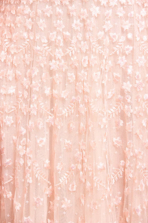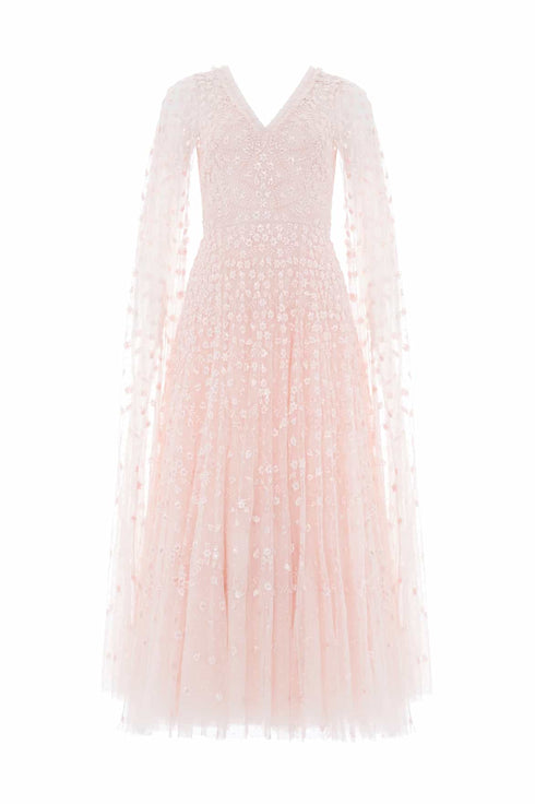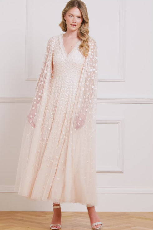 The Clover Cape Sleeve Ankle Gown in Opal. A graceful statement style with early 20th-century influences. Intricate floral embroidery with shimmering sequins trails across the bodice and cape sleeves, gradually softening into swirling motifs near the hem. The opal tone enhances the gown’s dreamy femininity, ideal romantic evenings.