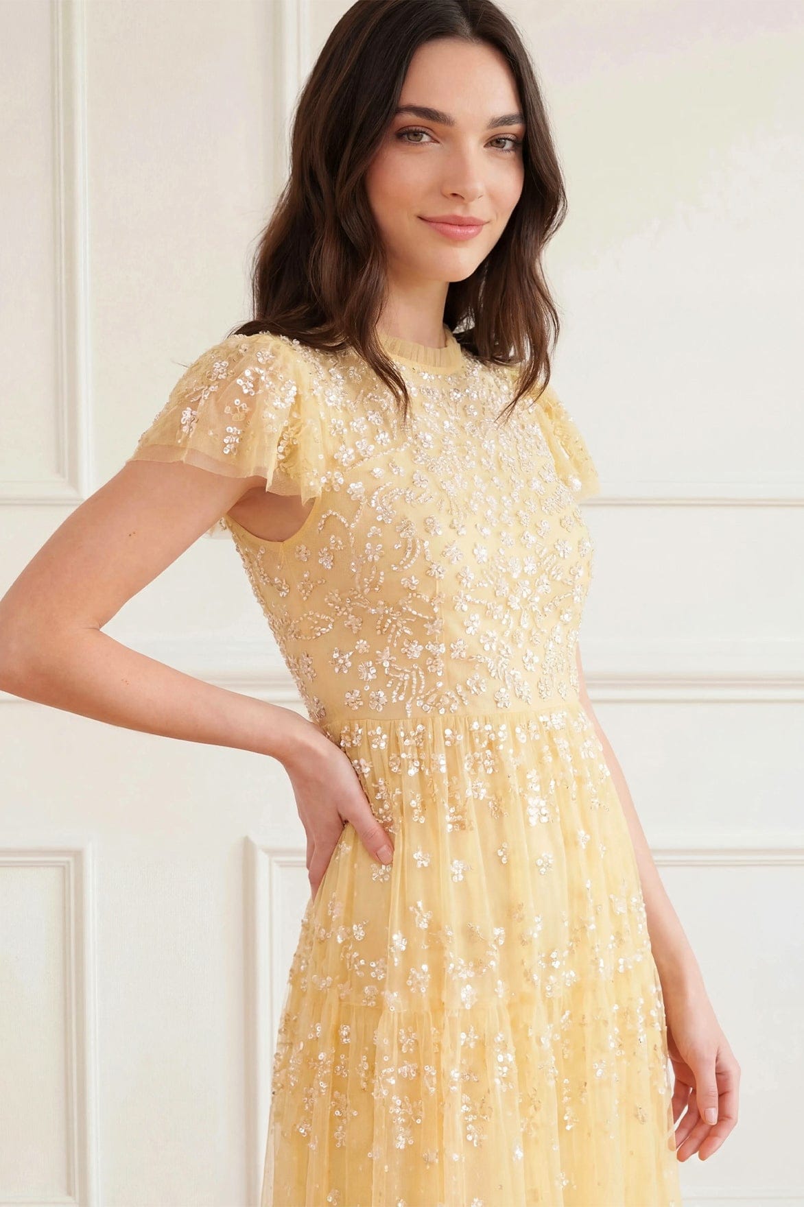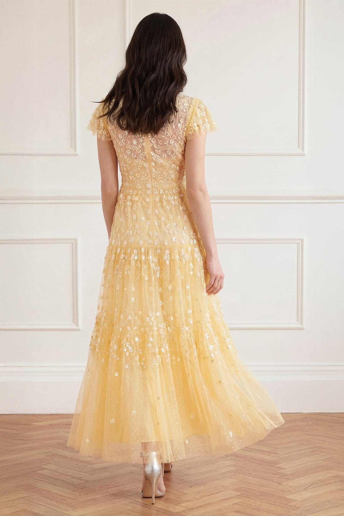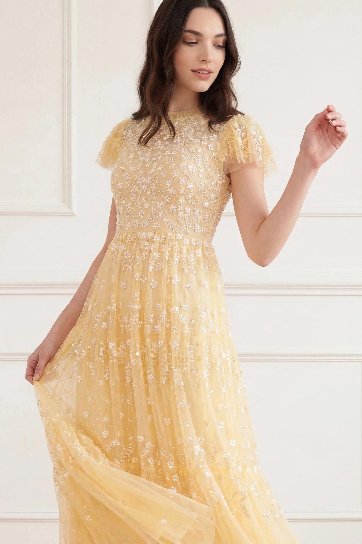 NEW SEASON. The Clover Short Sleeve Ankle Gown in Citron. Inspired by romantic garden florals, featuring a soft flowing silhouette with delicate short sleeves. Designed for graceful movement, this ankle-length style offers effortless elegance for occasionwear.