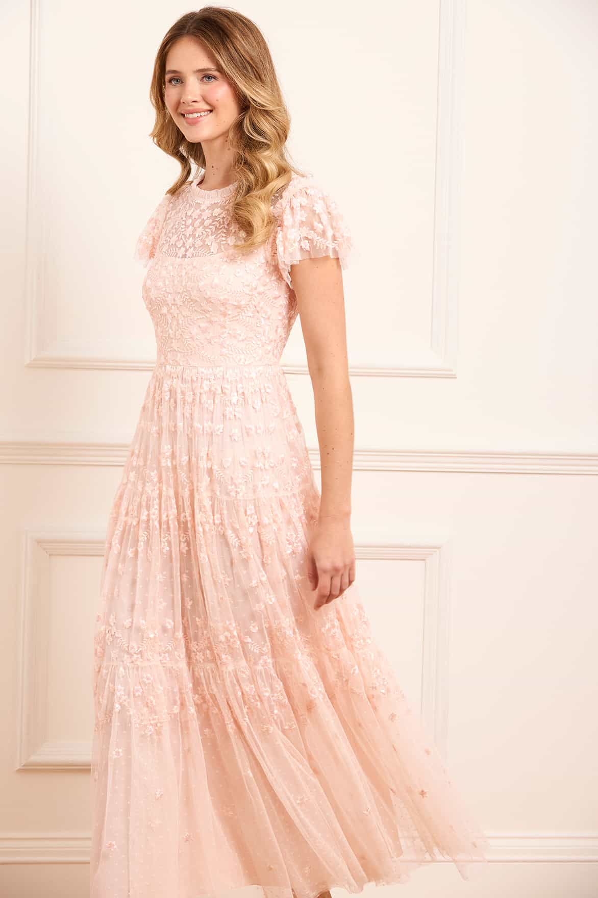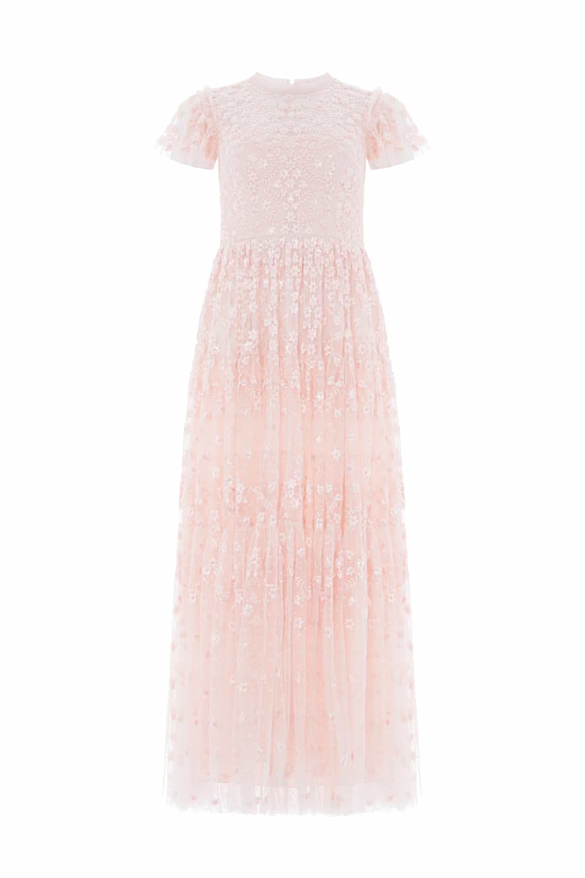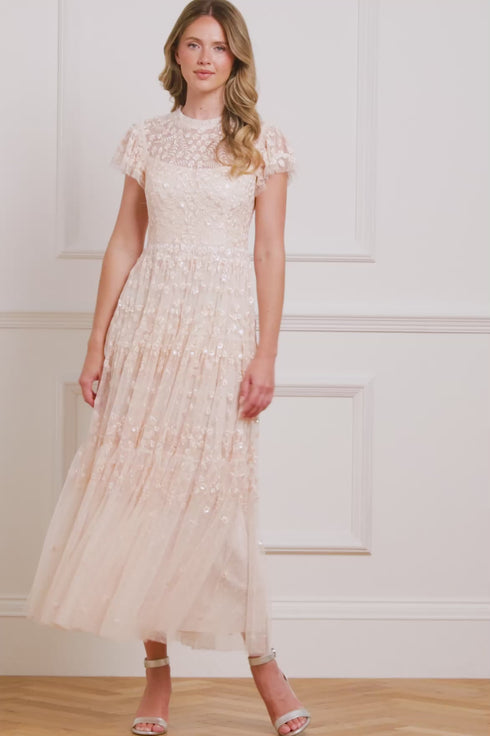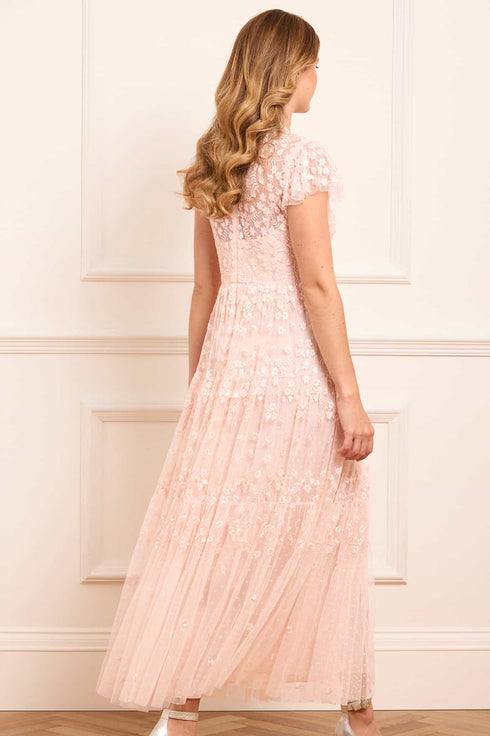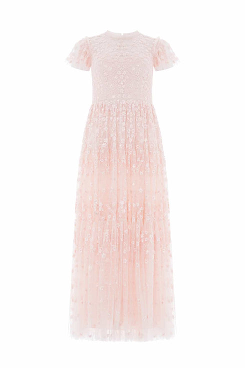The Clover Short Sleeve Ankle Gown in Opal. A softly romantic piece inspired by vintage lacework. Featuring intricate embroidery in floral and scalloped patterns, the artwork fades into whimsical swirls as it reaches the hem. Finished with short sleeves and layered tulle, this gown is perfect for elegant celebrations and feminine dressing.