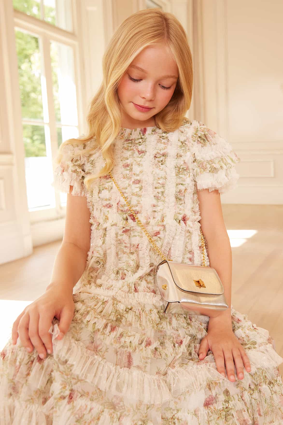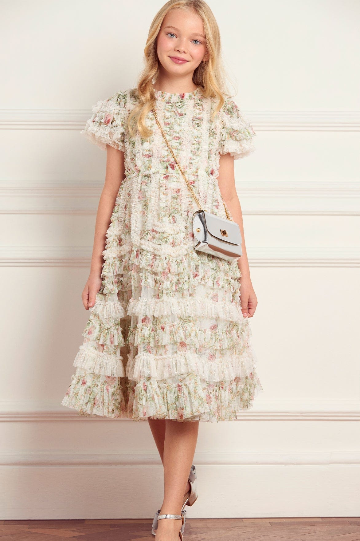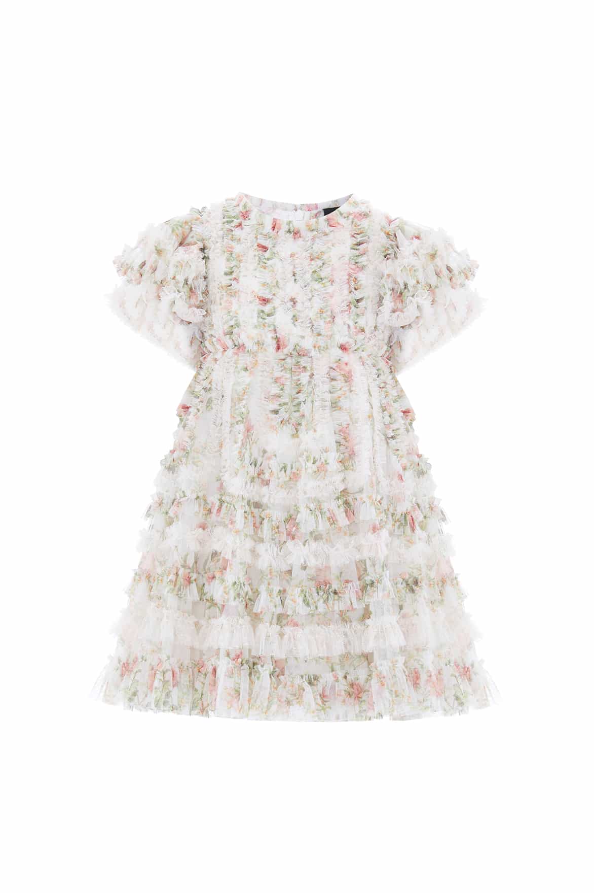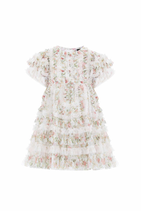 The Colette’s La Vie En Rose Short Sleeve Kids Dress in Moonshine/Cream. A frothy, romantic style featuring softly gathered frills and a printed floral base. This mini version of the women’s gown brings dreamy elegance to any special occasion. Ideal for picture perfect family moments with the matching Colette’s La Vie En Rose Gown.
