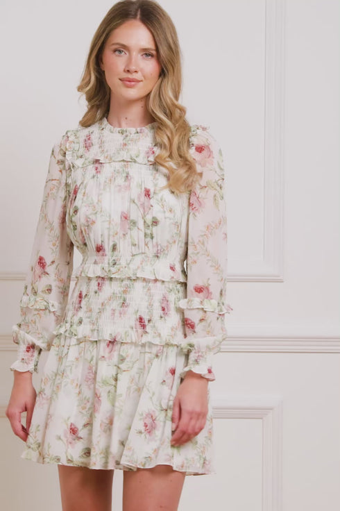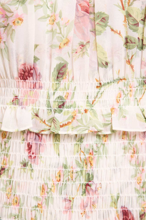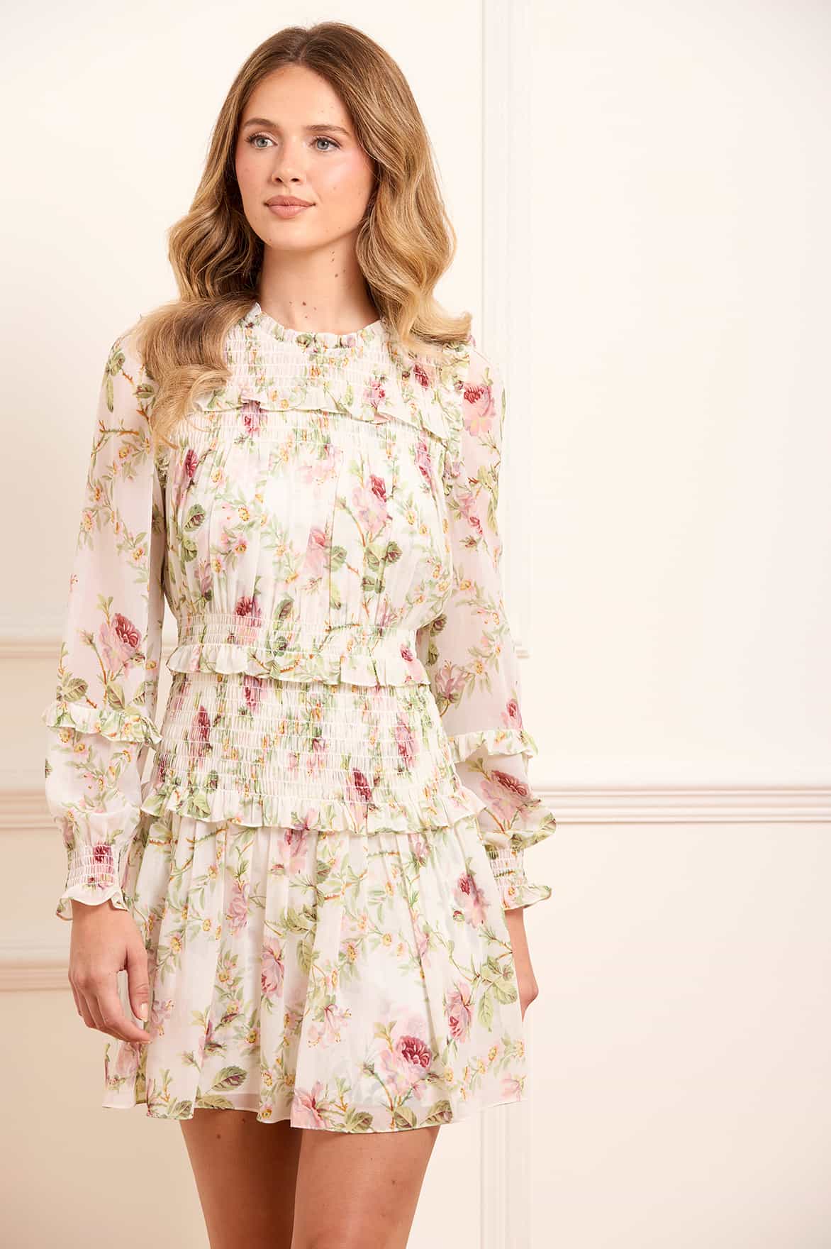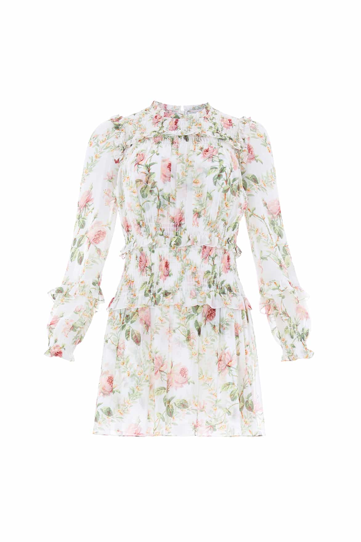 The Colette’s Rose Emilia Georgette Micro Mini Dress in Moonshine. A playful and romantic piece. Featuring this season's signature Colette’s Rose floral print, this short silhouette is perfect for dressing up or down.