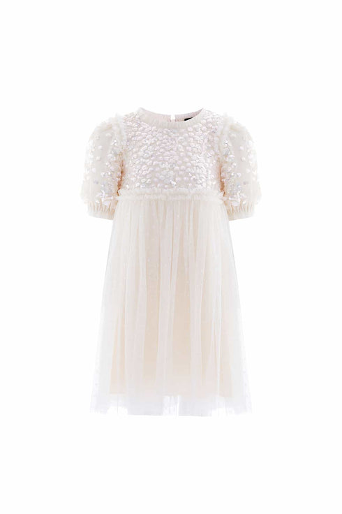 The Confetti Bodice KIDS Dress in Cream. This dreamy dress is full of sparkle and magic. The bodice is sprinkled with delicate sequin dots and sweet floral motifs, creating a fun confetti effect. The structured puff sleeves add a touch of princess drama, while the voluminous tulle skirt is made for endless twirls. Soft, signature Needle & Thread tulle frills decorate the neckline, shoulders, and waist, adding an extra sprinkle of fairytale charm to this playful and elegant dress.