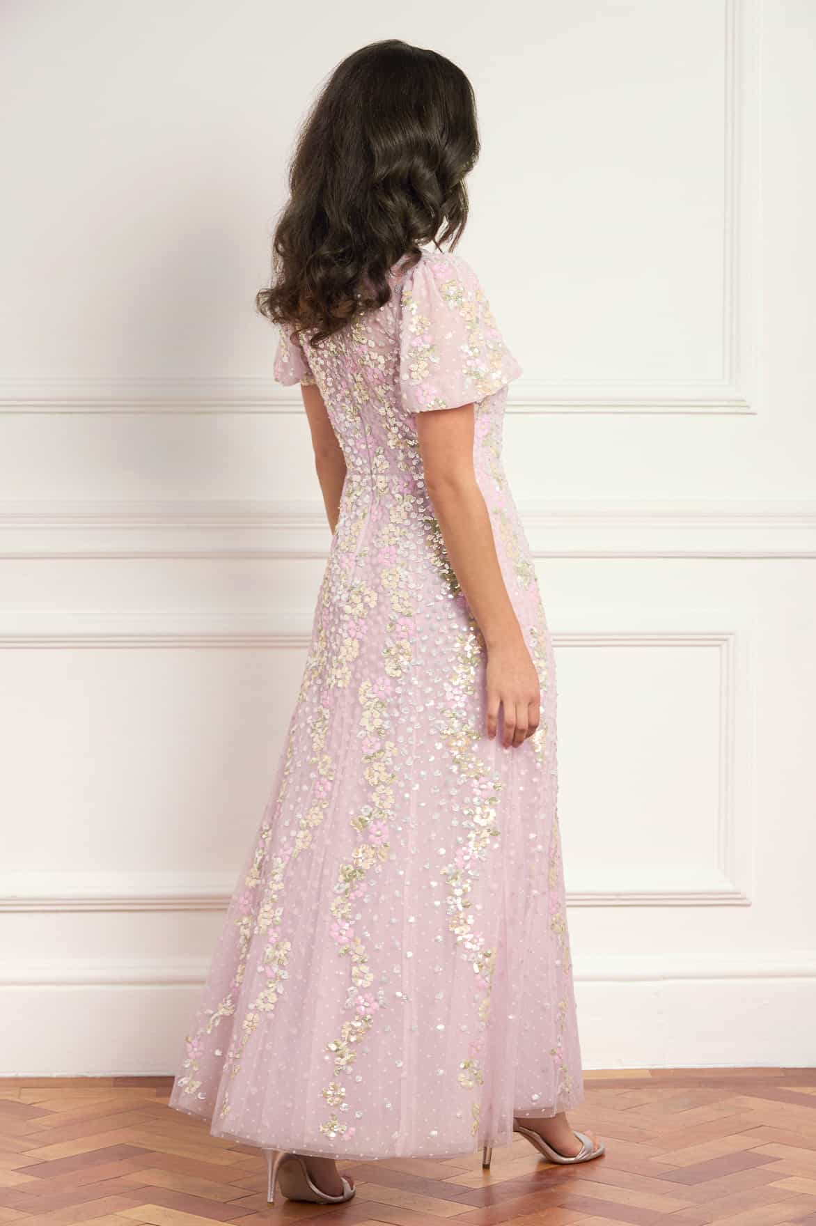NEW SEASON. The Confetti Round Neck Ankle Gown in Powder Lilac/Multi. This romantic gown features delicate floral sequin artwork that gently disperses towards the hem for a soft, ethereal effect. Designed with a round neckline and flowing ankle-length skirt for effortless elegance.