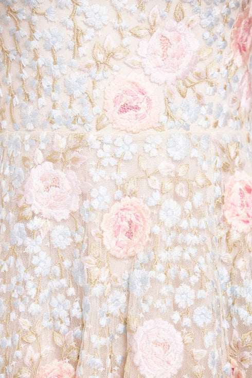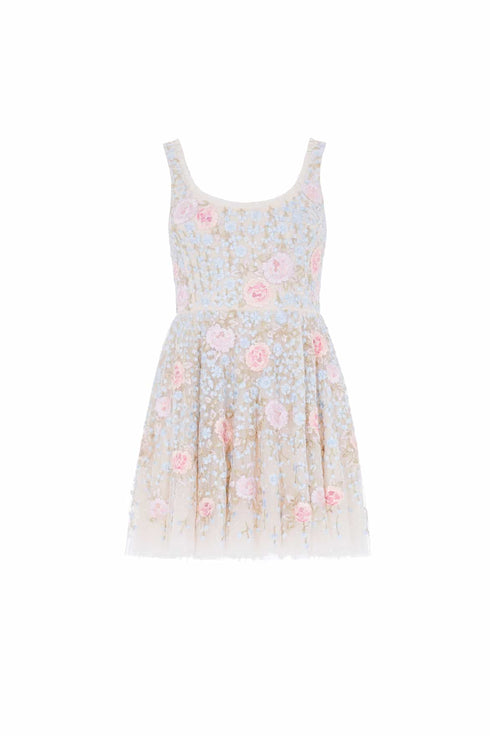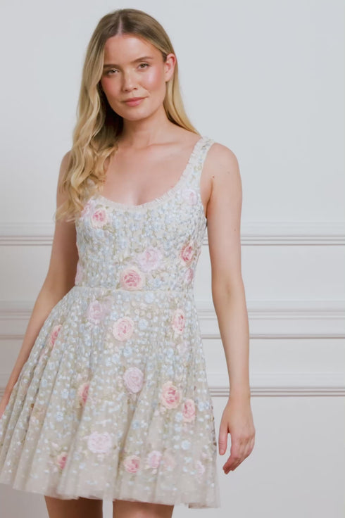 NEW SEASON. The Cressida Embroidery Scoop Neck Micro Mini Dress in Cream/Multi. Beautifully adorned with delicate floral motifs. Designed with a scoop neckline and layers of soft tulle, this playful silhouette brings a modern twist to classic Needle & Thread artistry.