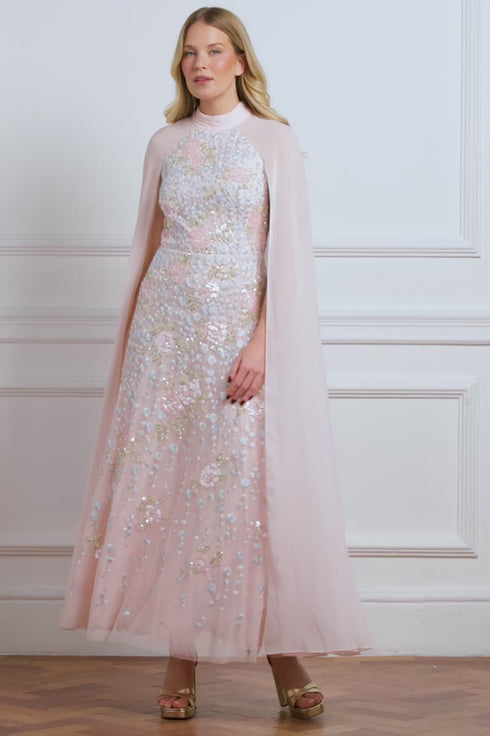 NEW SEASON. The Cressida Floral Cape Ankle Gown in Seashell/Multi. Features exquisite embroidered blooms and a delicate chiffon cape. Designed with raglan seams and soft movement through the skirt, this gown evokes ethereal romance and graceful sophistication.