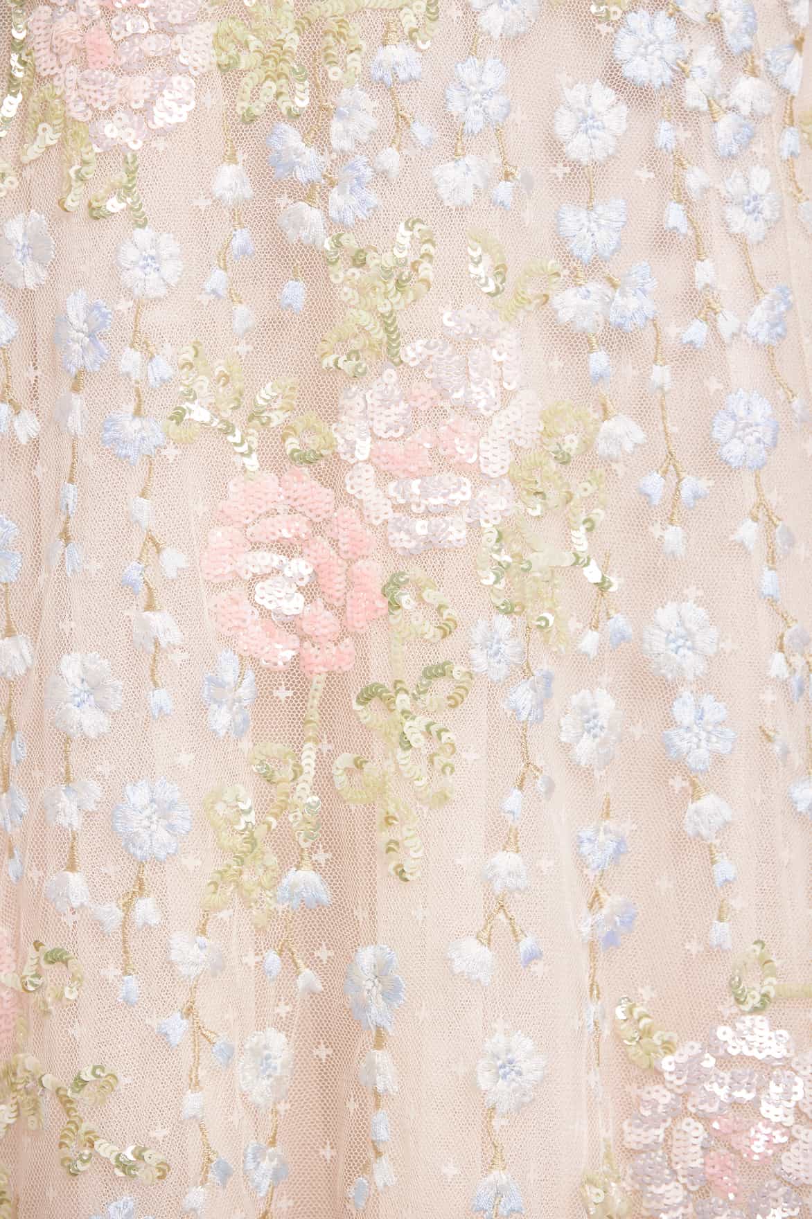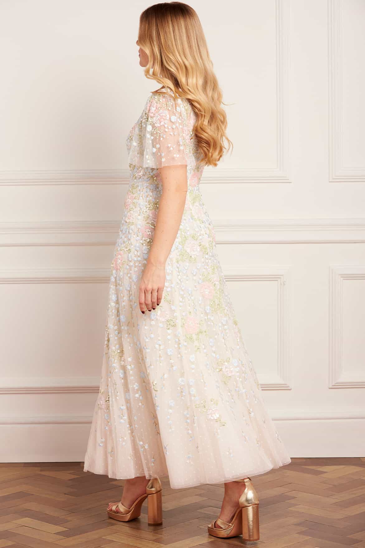 NEW SEASON. The Cressida Floral Short Sleeve Ankle Gown in Cream/Multi. A romantic ankle-length design embellished with intricate floral embroidery. Finished with short sleeves and a fluid tulle skirt, this gown radiates feminine elegance and Needle & Thread’s signature attention to detail.