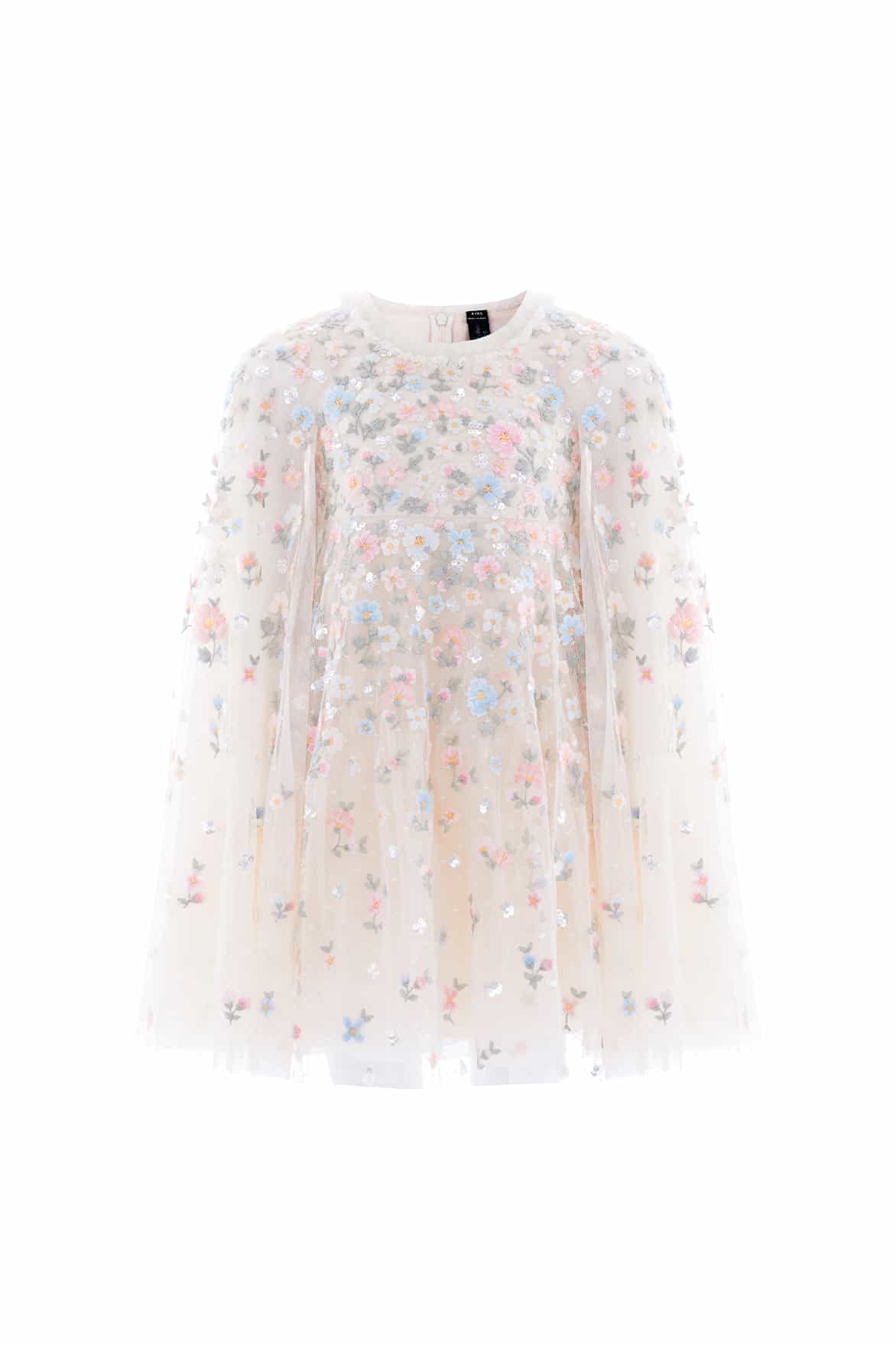 The Dahlia Ditsy Cape Kids Dress in Cream/Multi. This enchanting dress features shimmering sequin dots and delicate floral embroidery. A soft tulle cape, adorned with floral motifs, adds a whimsical touch. With layers of net and tulle for a twirl-worthy skirt, it’s the perfect fairytale dress for your little one’s special occasions.