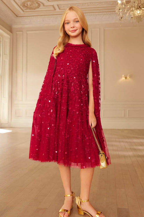 NEW SEASON. The Dahlia Ditsy Cape Kids Dress in Red. A whimsical piece inspired by Victorian florals in the Bright Star story. Designed with embroidered ditsy blooms scattered across tulle, the cape sleeves create an ethereal, fairy-tale effect. The vivid red colour adds festive vibrancy, while the flowing skirt ensures freedom of movement for dancing and play. Pair with the Dahlia Ditsy Cape Gown in Red from the womenswear collection for a mother-and-daughter match.