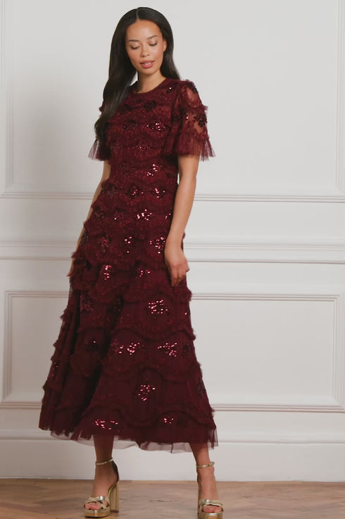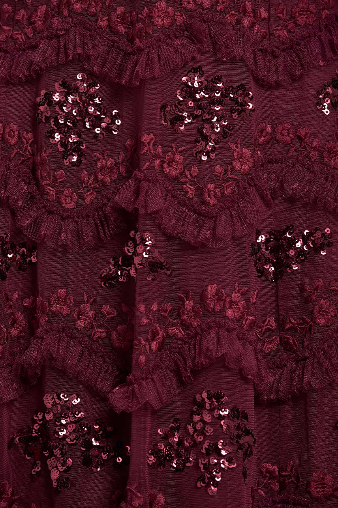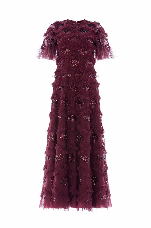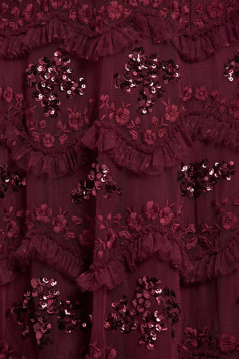 NEW SEASON. The Daisy Wave Ankle Gown in Claret. Channeling organic texture with bold femininity this gown is adorned with undulating daisy sequin motifs, and tulle layers that move with softness and sparkle. The deep claret shade offers a rich contrast to the delicate detailing; perfect for a romantic twist on evening dressing.