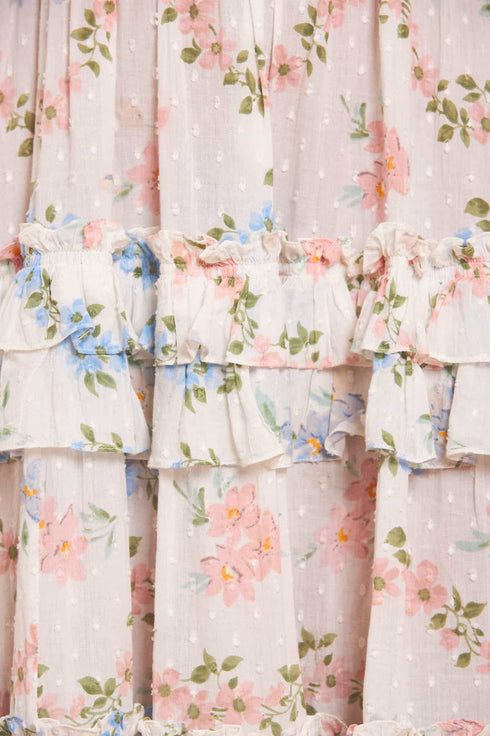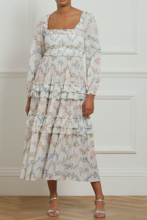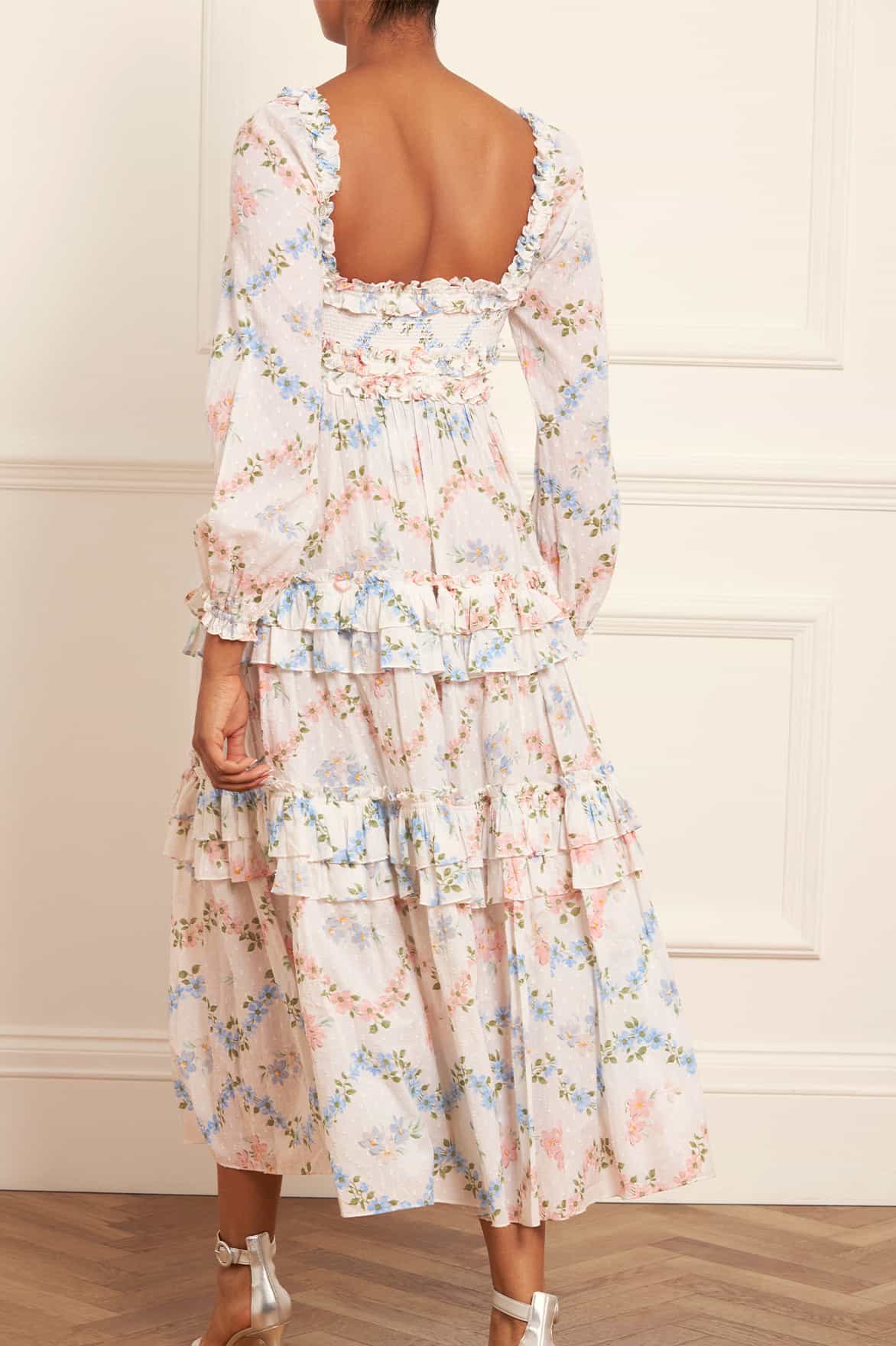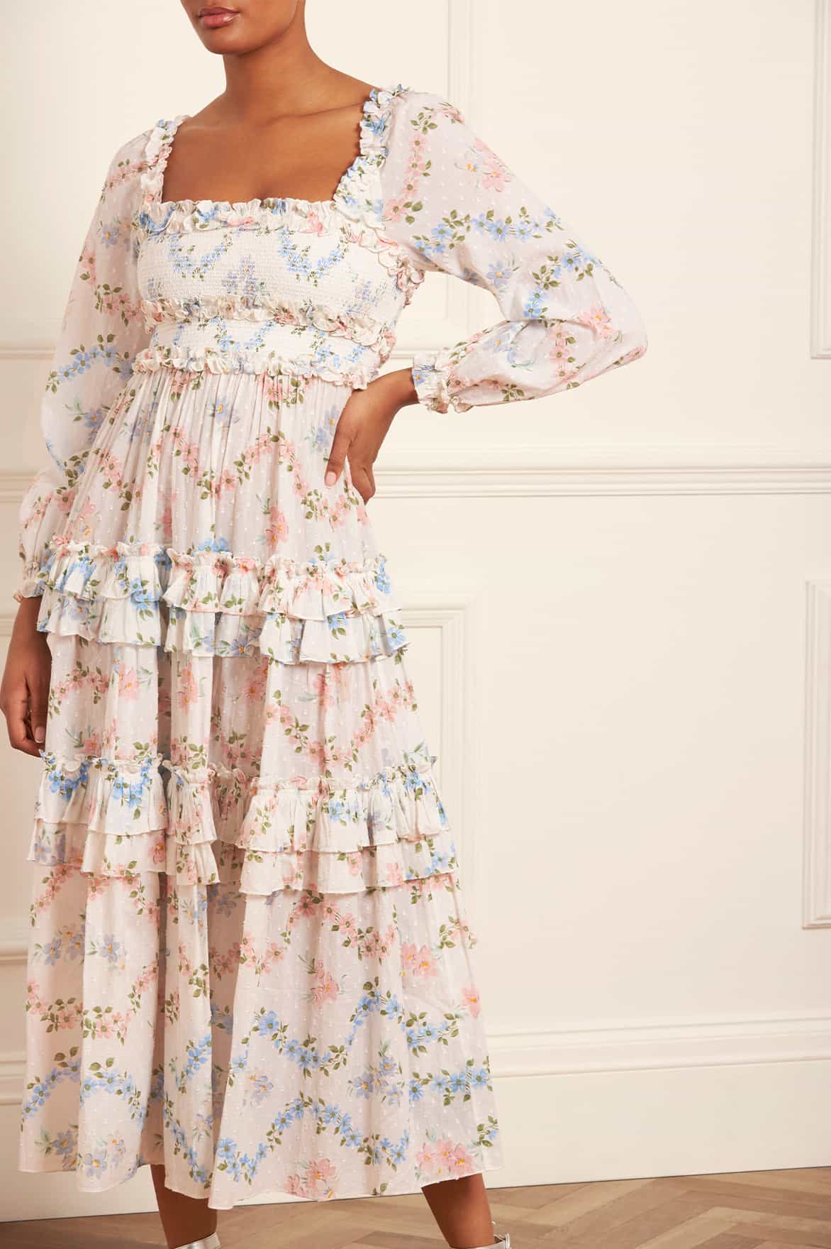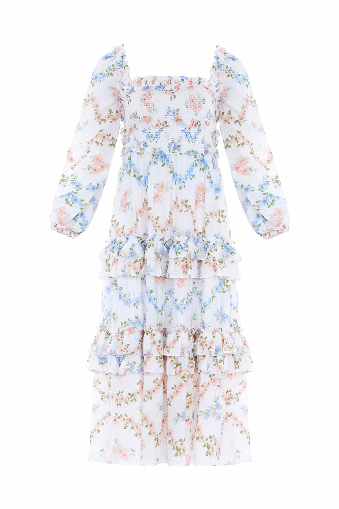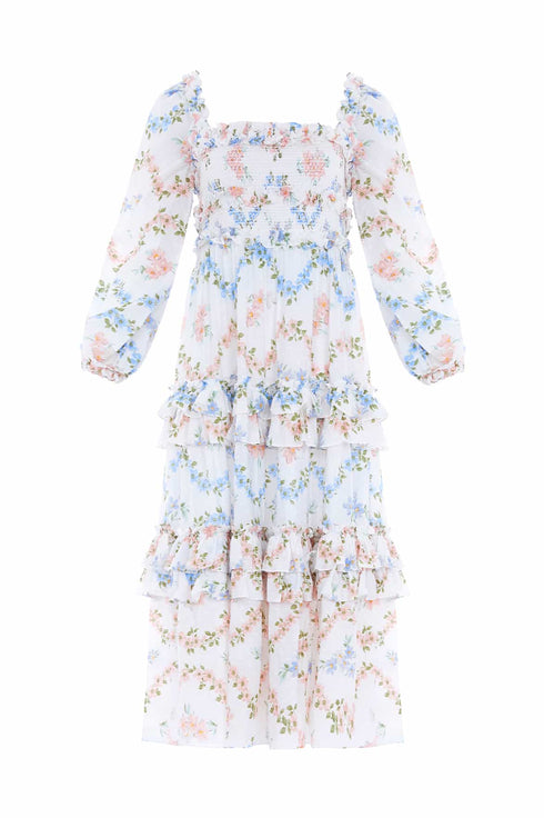 The Dancing Daisies Cotton Smocked Ankle Gown in Moonshine. This playful print is taken from an early 1900’s hand-painted artwork. Developed with undulating borders of flower motifs to create a floral stripe print in soft pastel shades of pink and blue. Designed with a smocked, elasticated bodice for comfort and fit, with intricate embroidery for a vintage inspired look. Beautifully adorned with frills and tiers on soft organic cotton with a dobby weave for added texture. A transitional day to night piece.