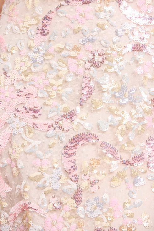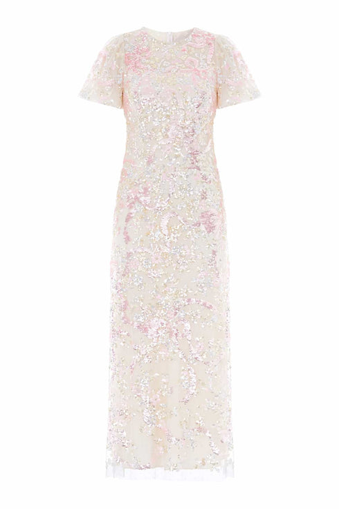 NEW SEASON. The Dancing Ribbon Puff Sleeve Gown in Cream/Multi. Exquisite sequin artwork depicts dancing ribbons and floral motifs in an organic trailing formation across the gown. Designed with puff sleeves and a slim silhouette, this style elongates the figure with delicate sparkle.