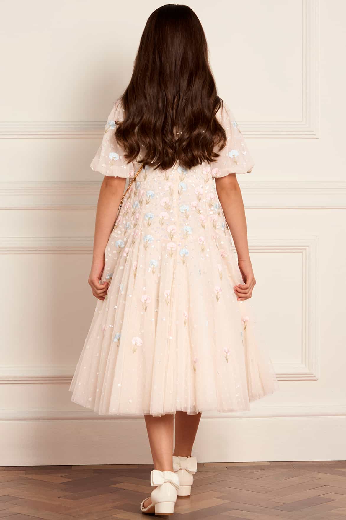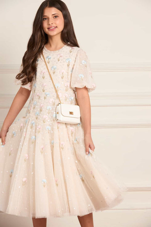 NEW SEASON. The Dandelion Ditsy Kids Dress in Cream. A charming design adorned with ditsy florals. Crafted with gentle volume and frill detailing, it’s perfect for playdates, birthdays, and family occasions.