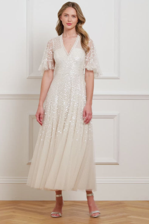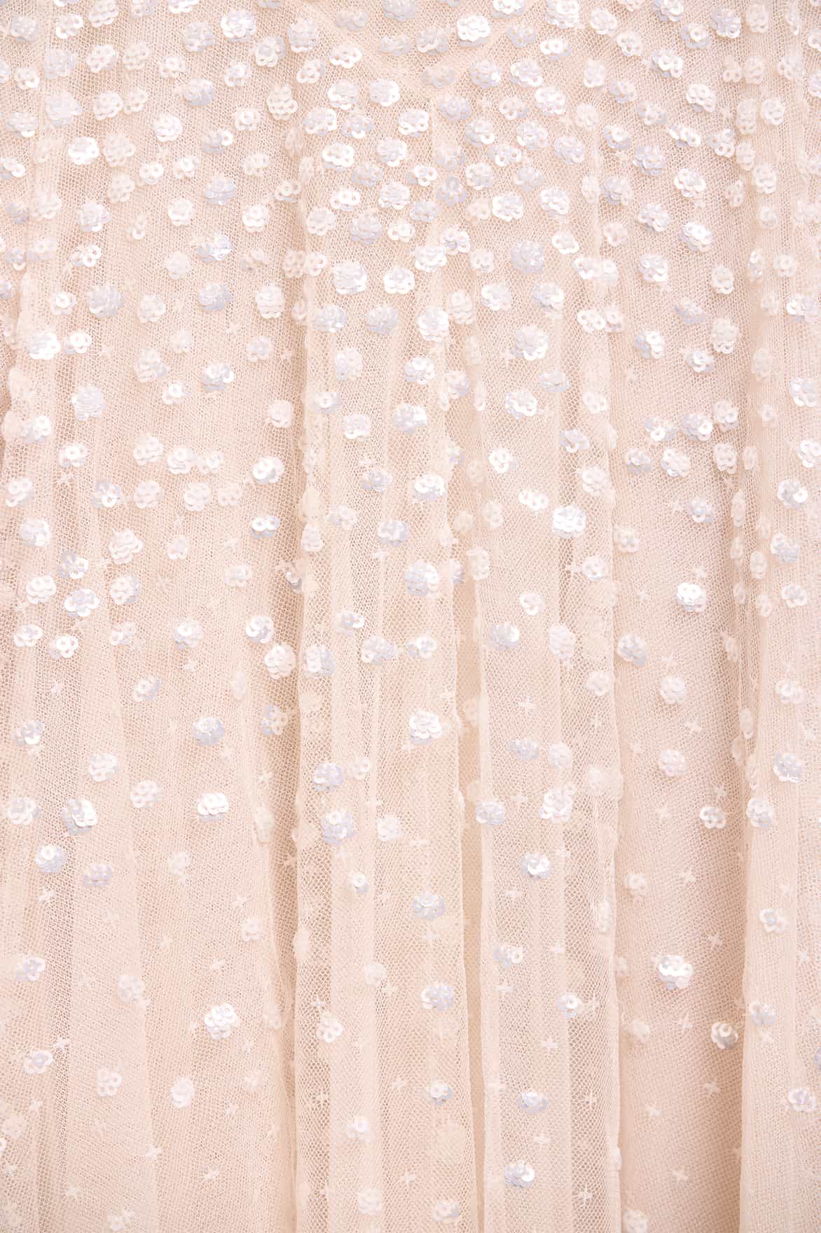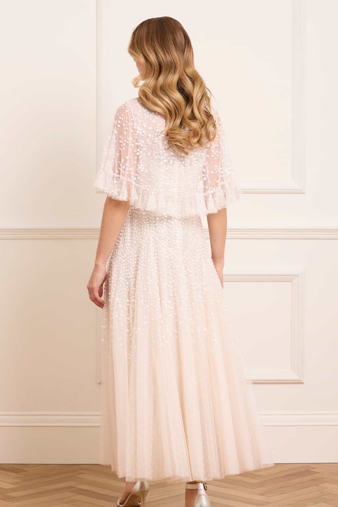 NEW SEASON | NEEDLE & THREAD EXCLUSIVE. The Dappled Sequin Cape Ankle Gown in Cream. A graceful romantic design, this ethereal gown features an integrated cape with softly gathered frill detailing, adding fluid movement and a touch of drama. Crafted with delicate clusters of shimmering sequins intricately scattered across the fabric, creating a light-catching, dappled effect. Designed with signature Needle & Thread tulle ruffles framing the neckline, while chevron seaming sculpts the waist and hips before falling into a voluminous, frothy skirt. Crafted from generous layers of net and tulle, this gown is destined for truly unforgettable moments.