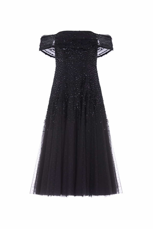 The Dappled Sequin Draped Off-Shoulder Midaxi Dress in Graphite. A contemporary statement style covered in clustered dot sequin motifs that scatter toward the hem. The draped neckline and midaxi length offer a striking silhouette. Pair with heels and jewellery of your choice for a dramatic entrance.