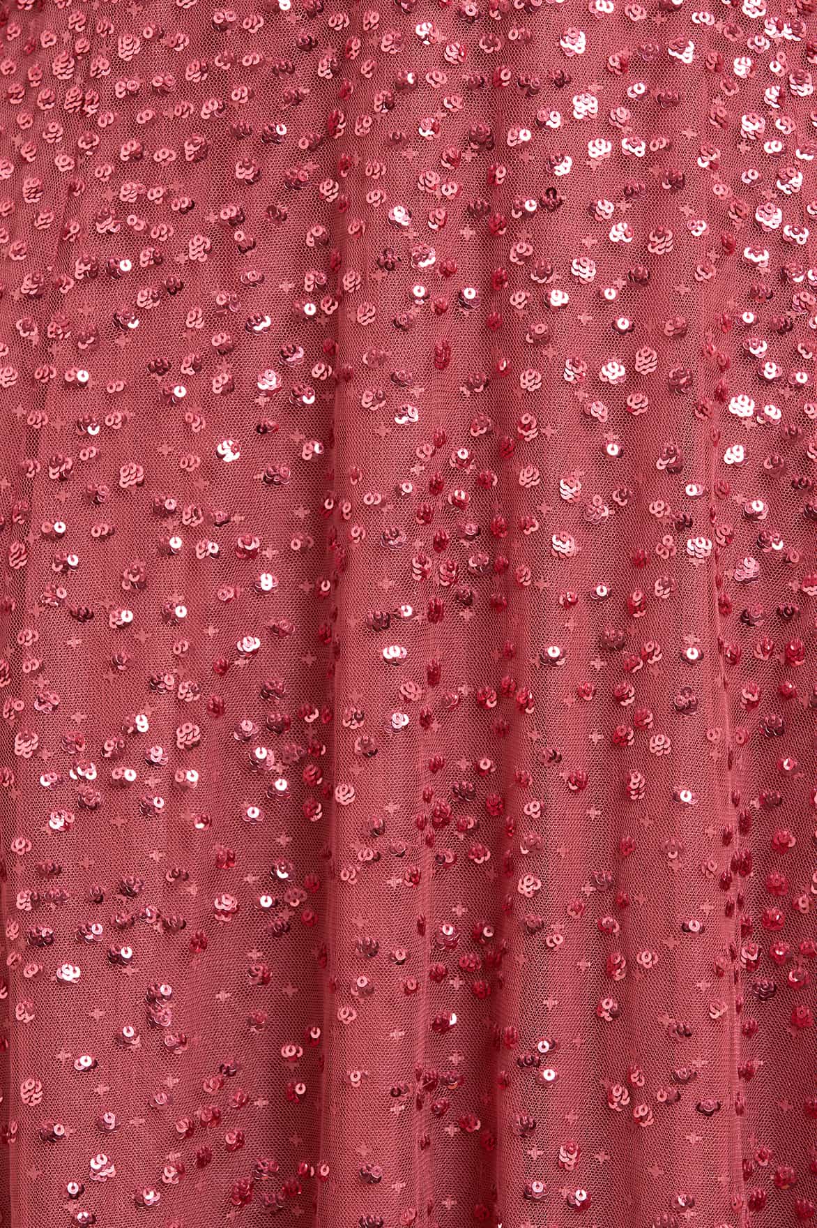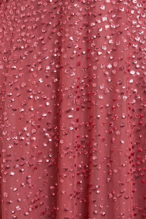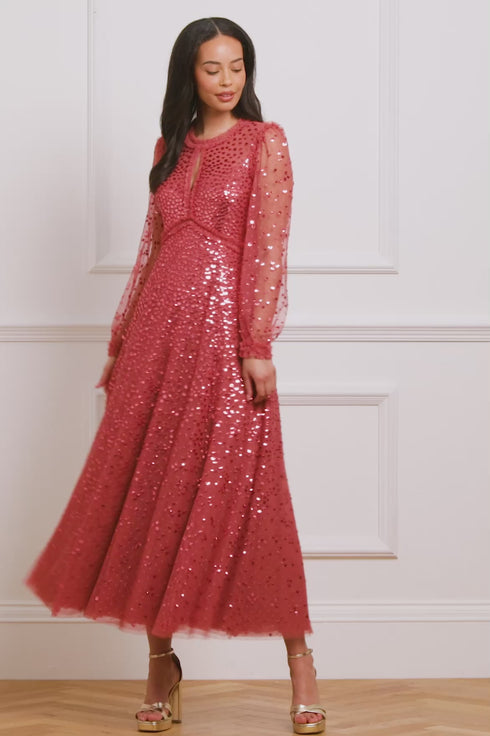 The Dappled Sequin Long Sleeve Ankle Gown in Dark Rose. This beautiful dress features a cascade of clustered sequin dots, scattered across the soft tulle base. With long fitted sleeves, a classic round neckline and gently flared skirt, this piece blends romance and radiance for a sophisticated finish.