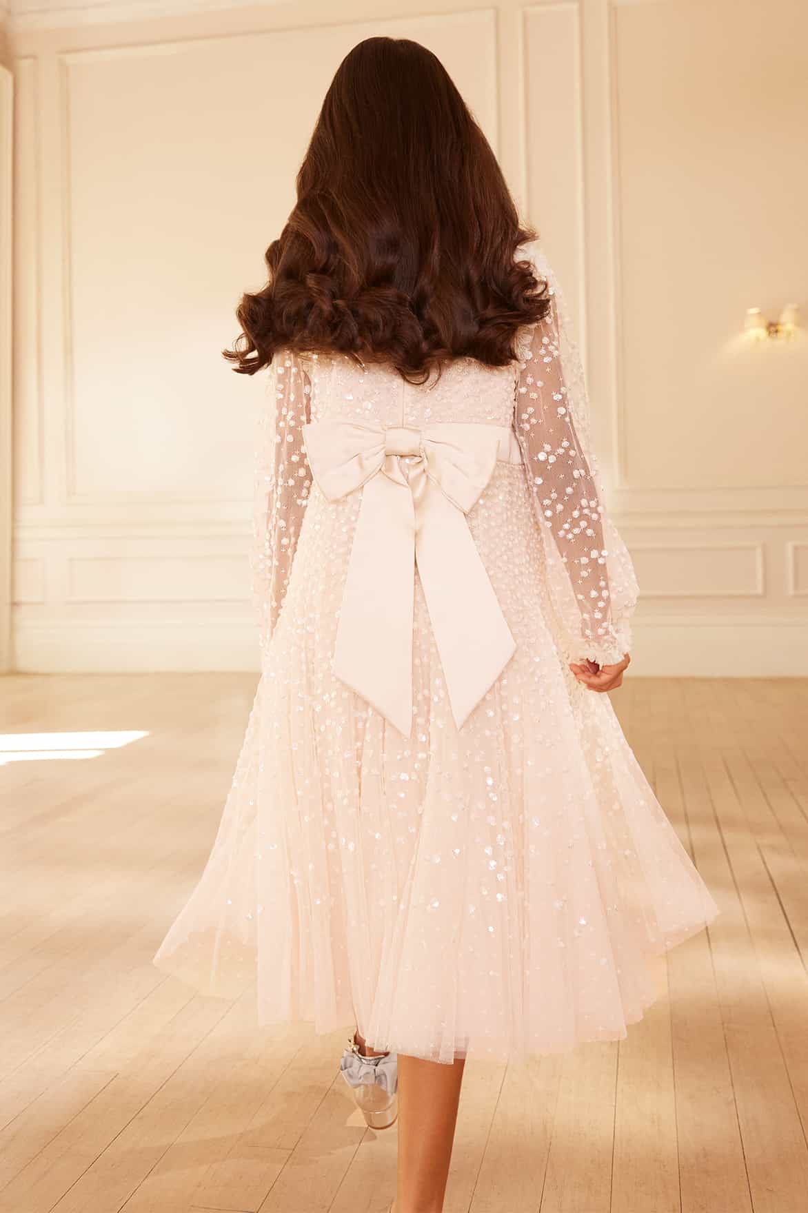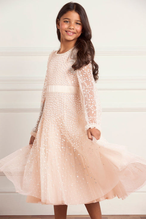 The Dappled Sequin Long Sleeve Kids Dress in Cream/Opal. A magical party dress featuring a soft tulle base scattered with delicate sequin dot motifs. With a fitted bodice and a flowing skirt, this style glimmers gently with movement. A perfect pairing with the women's Dappled Sequin Gown for a coordinated mummy-and-me moment.