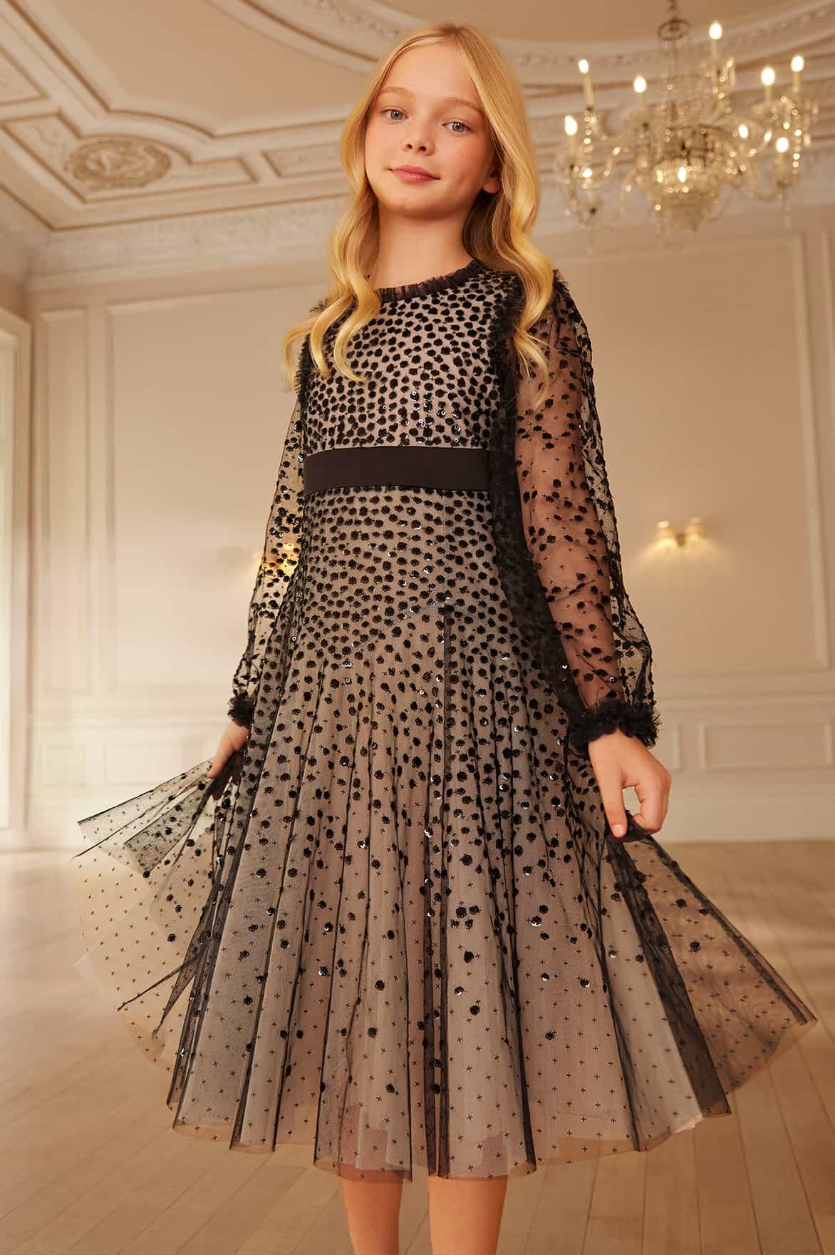 The Dappled Sequin Long Sleeve Kids Dress in Graphite/Opal. A shimmering design ideal for festive occasions. Crafted from signature kisses 'x' motif tulle, the dress features a gradient of clustered sequins fading into a flared skirt. Pairs beautifully with the women's Dappled Sequin Gown for a chic coordinated look.