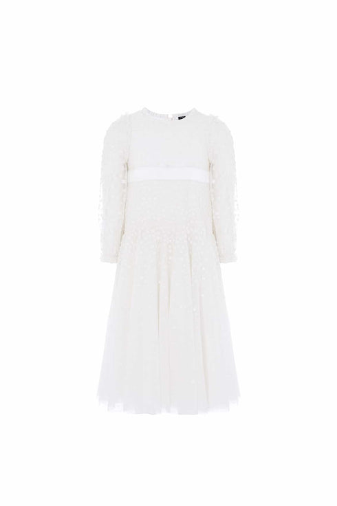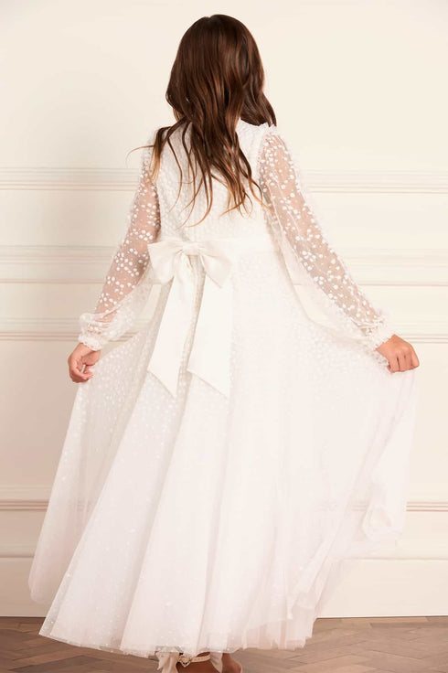 NEW SEASON. The Dappled Sequin Long Sleeve Kids Gown in Swan White. Glimmers with scattered sequins across layers of tulle. Designed with long sleeves and a soft, flowing skirt, this gown adds gentle sparkle to special occasions.