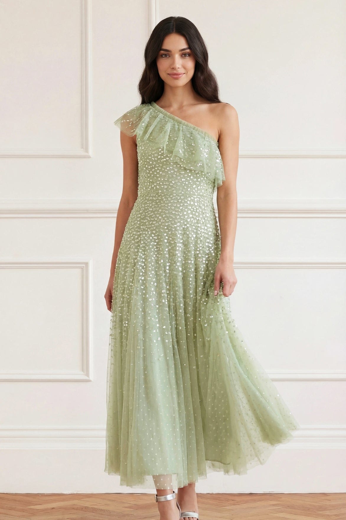 The Dappled Sequin One Shoulder Ankle Gown in Meadow. This gown is crafted in delicate tulle and designed with a romantic one-shoulder neckline, framed by soft, circle-cut frills. Intricately embellished with shimmering sequin clusters that gently scatter toward the hem, it catches the light with every movement. Chevron seaming sculpts the silhouette through the hips before falling into a full, frothy skirt of layered net and tulle with a graceful sweeping hem. Perfect for evening soirées, red carpet moments, and unforgettable celebrations.